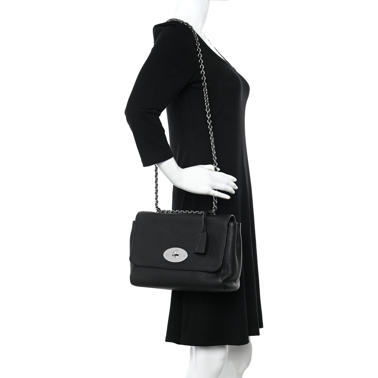 This is an authentic MULBERRY Small Classic Grain Calfskin Medium Lily Flap in Black. This super-chic shoulder bag is crafted of luxurious leather with a grainy calfskin leather in black. The bag features silver chain link top handles a cross over flap, and a silver turn lock. The turn lock opens to a fabric interior with a zipper pocket.Follow this item for alerts. Mulberry is a registered trademark of Mulberry. FASHIONPHILE is not affiliated with Mulberry.