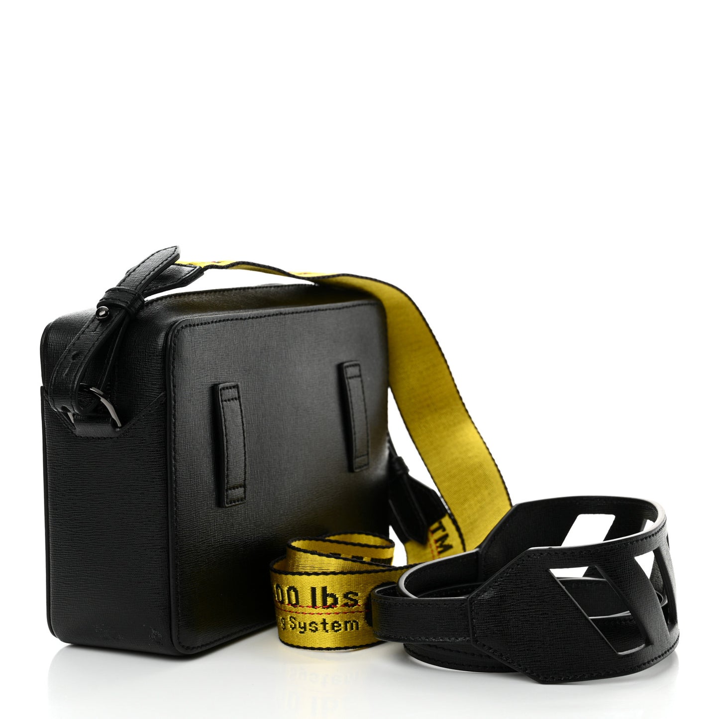 This is an authentic OFF-WHITE Saffiano Diag Camera Bag in Black. This bag is crafted of grained saffiano leather in black and white. The bag features a yellow canvas strap with the wording "off-white" embroidered on it, a black leather adjustable belt strap and gunmetal hardware. The top is open to a black fabric interior with a patch pocket.Follow this item for alerts. Off-White is a registered trademark of Off-White. FASHIONPHILE is not affiliated with Off-White.
