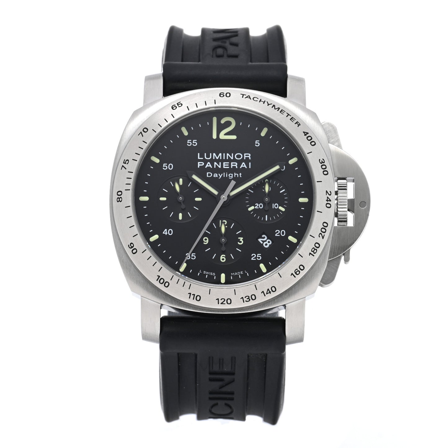 This is an authentic PANERAI Stainless Steel Rubber 44mm Luminor Daylight Chronograph Automatic Watch Black PAM00250. This watch is crafted of stainless steel and features a black dial with three sub-dials, luminous hands and hour markers, black rubber strap with additional alligator strap, sapphire crystal, and an automatic movement.Follow this item for alerts. Panerai is a registered trademark of Panerai. FASHIONPHILE is not affiliated with Panerai.