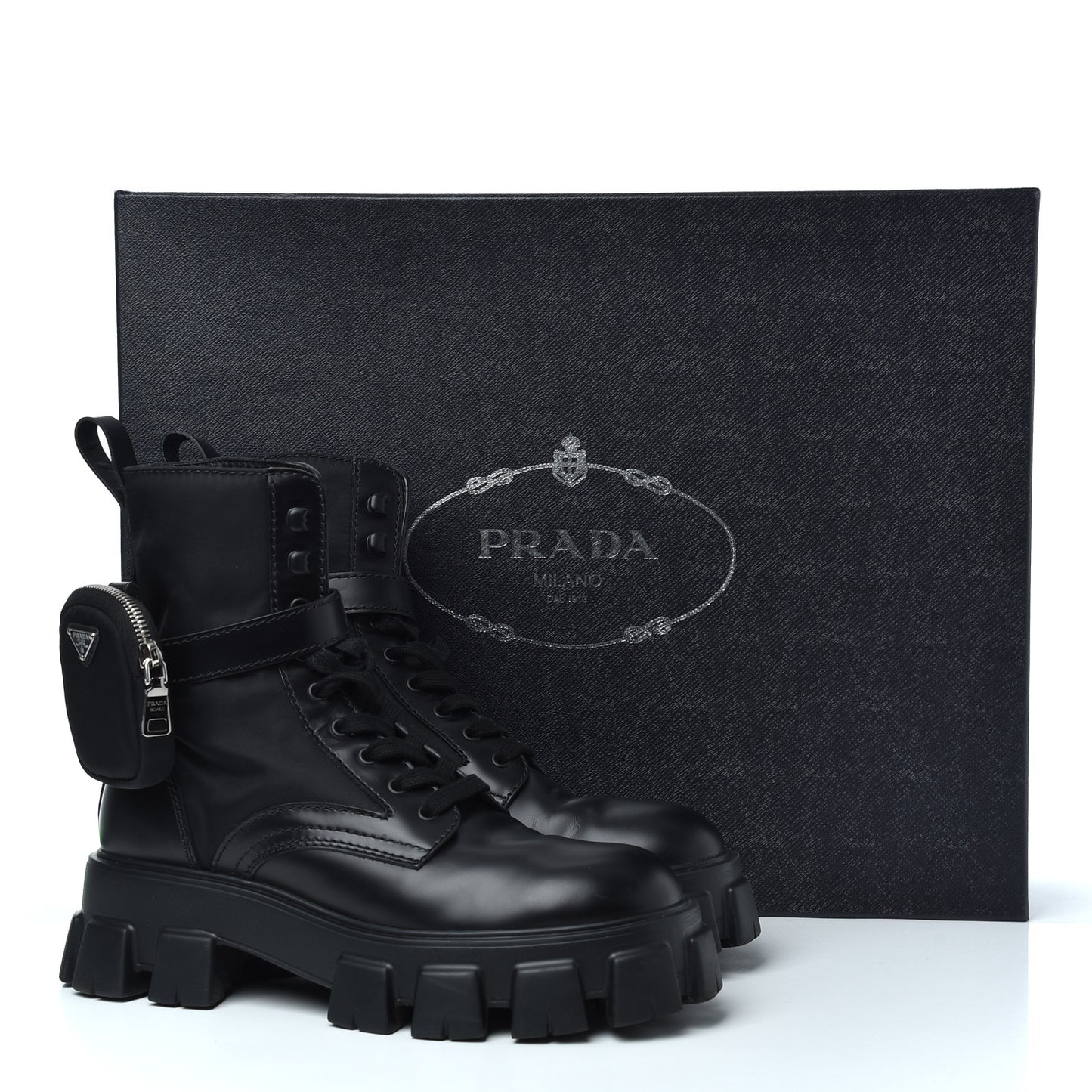 Prada/ Accessories/ Shoes /Prada Spazzolato Rois Re-Nylon Metal Triangle Logo Mens Monolith Pouch Pocket 60mm Combat Boots 8.5 Black