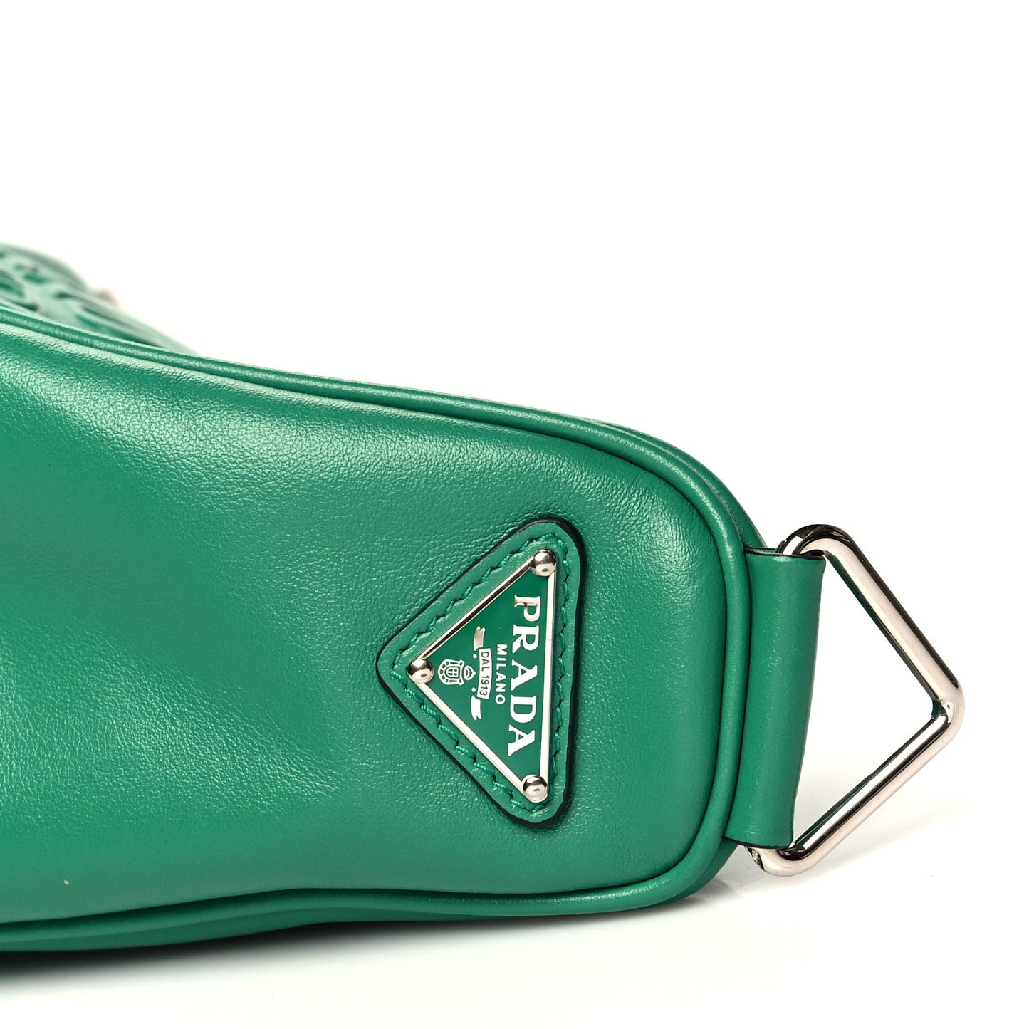 This is an authentic PRADA Calfskin Triangle Shoulder Bag in Mango. This stylish tote is crafted of green calfskin and features a black nylon shoulder strap with a removable coin purse. The bag opens to a black nylon jacquard interior.Follow this item for alerts. Prada is a registered trademark of Prada. FASHIONPHILE is not affiliated with Prada.