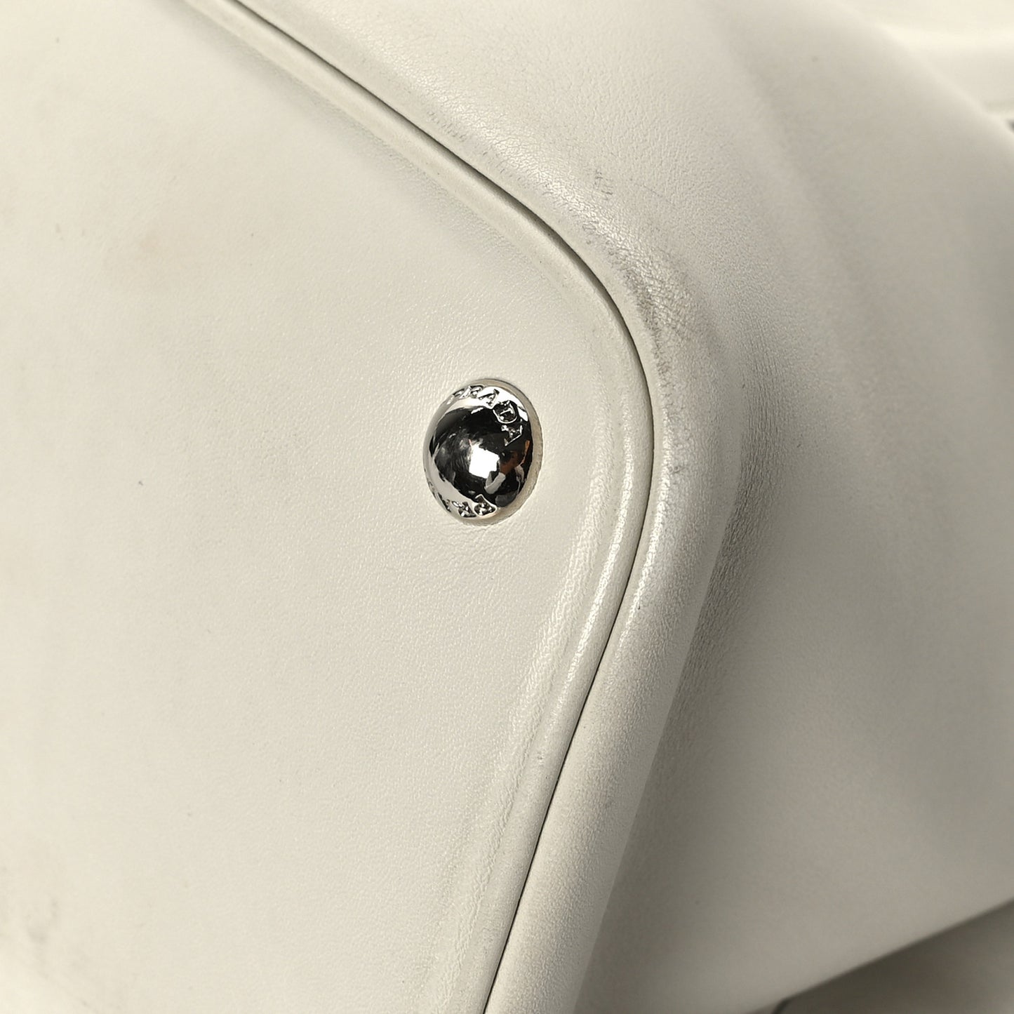 This is an authentic PRADA City Calf Large Double Bag in Talco. This tote is crafted of beautifully smooth calfskin leather in white. It features rolled leather top handles with a strap keeper, with polished silver hardware, a leather triangle with the Prada logo, a leather hanging ID tag and expandable snap sides. The top is open to a partitioned black leather interior with a central flap pocket.Follow this item for alerts. Prada is a registered trademark of Prada. FASHIONPHILE is not affiliated with Prada.