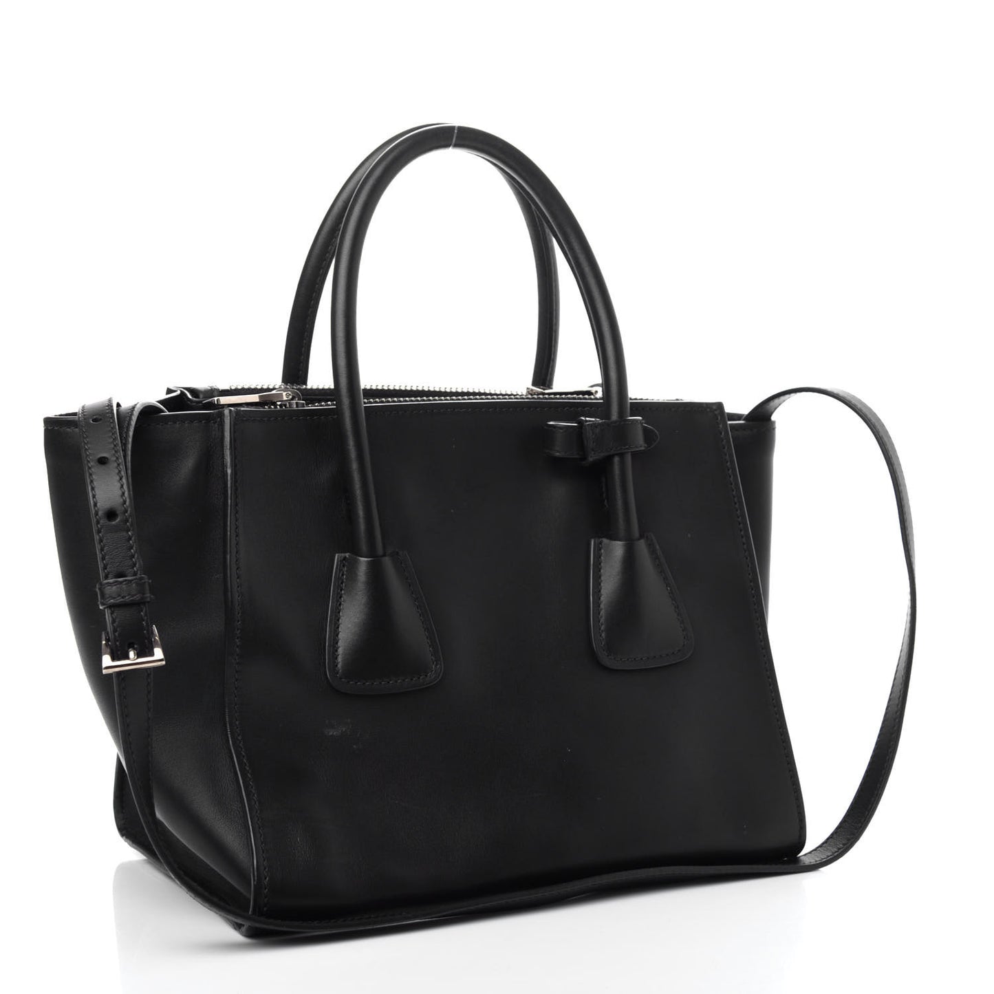 This is an authentic PRADA City Calf Twin Pocket Tote in Black. This stylish calfskin tote is a classic structure in black. The bag features rolled leather top handles with polished silver links. The top opens to a black Prada logo-jacquard interior with a patch pocket, zipper pocket, and two top zippered compartments.Follow this item for alerts. Prada is a registered trademark of Prada. FASHIONPHILE is not affiliated with Prada.