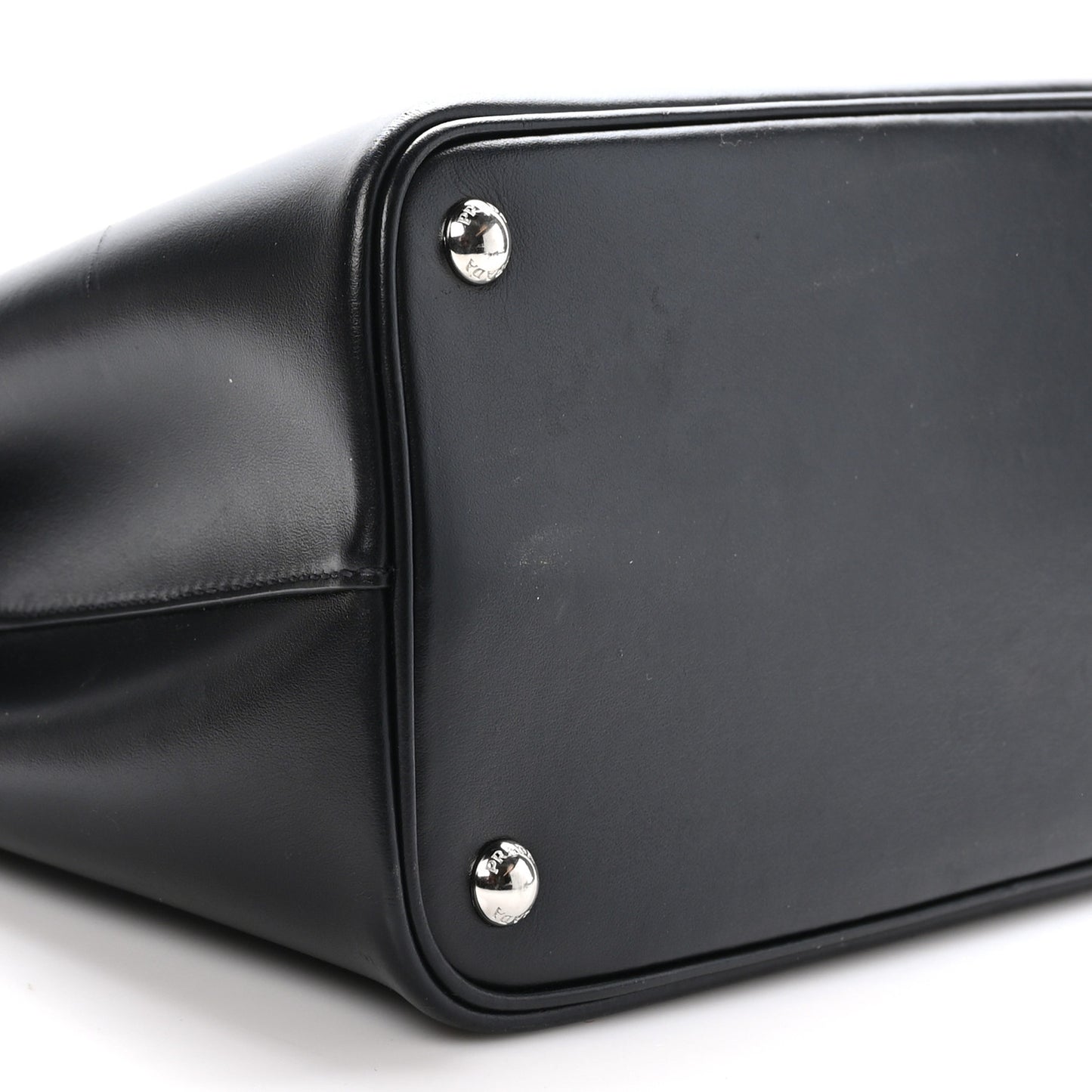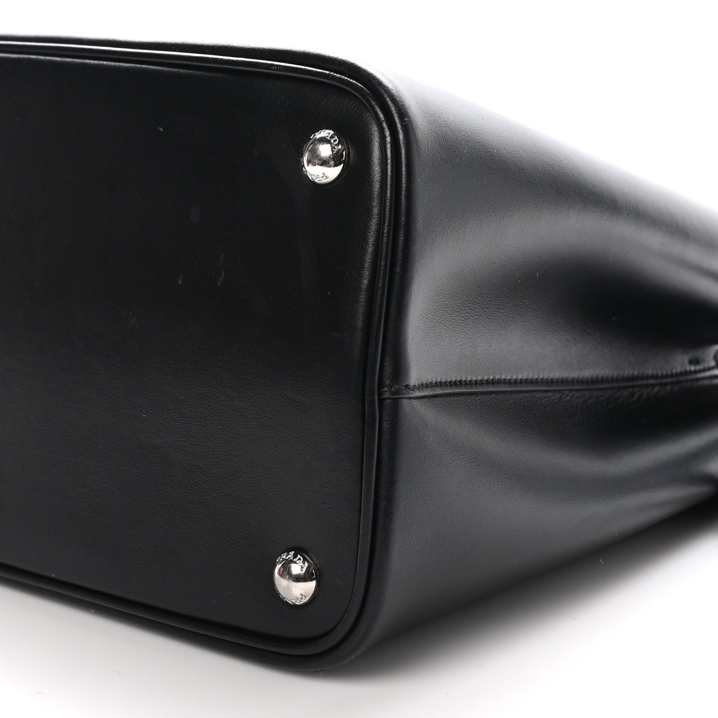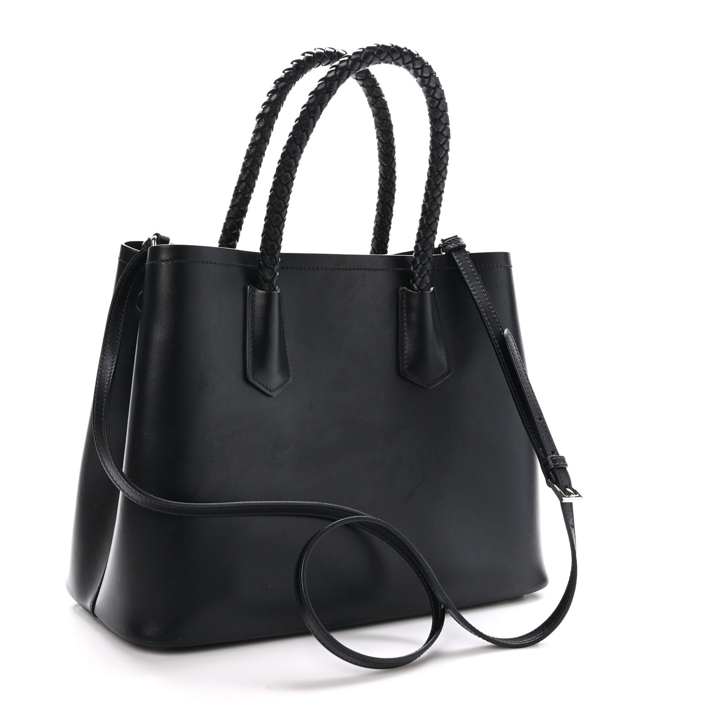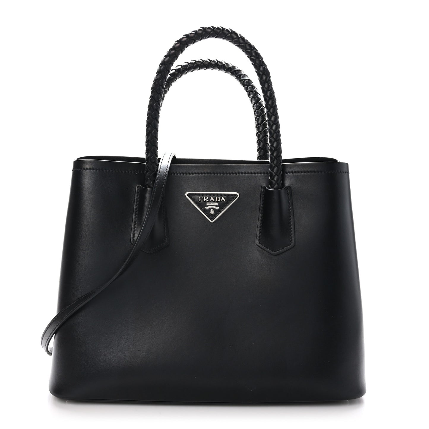 This is an authentic PRADA City Calfskin Braided Medium Double Bag in Black. This tote is crafted of polished calfskin leather in black. The bag features rolled braided leather top handles, and an optional, adjustable shoulder strap with polished silver hardware. The top is open to a partitioned smooth matching leather interior with a central flap pocket.Follow this item for alerts. Prada is a registered trademark of Prada. FASHIONPHILE is not affiliated with Prada.