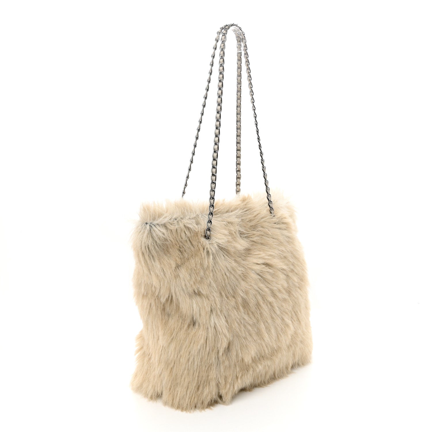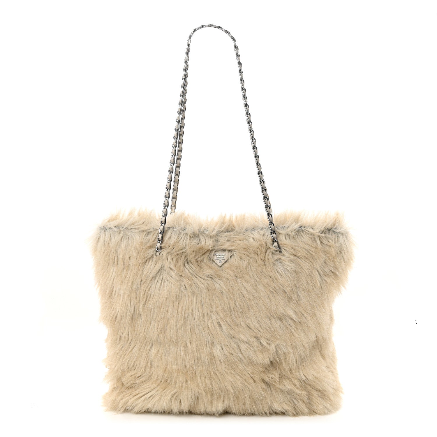 This is an authentic PRADA Eco Lapin Faux Fur Tote in Cipria. This stylish tote is finely crafted of luxurious eco-friendly faux rabbit fur, with silver tone chain link shoulder straps. The top zipper opens to a monogram jaquard textile with zipper and patch pockets.Follow this item for alerts. Prada is a registered trademark of Prada. FASHIONPHILE is not affiliated with Prada.