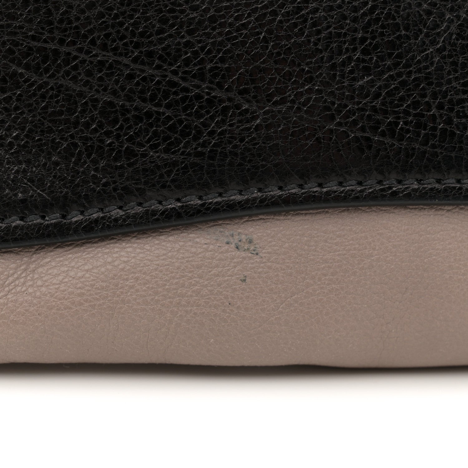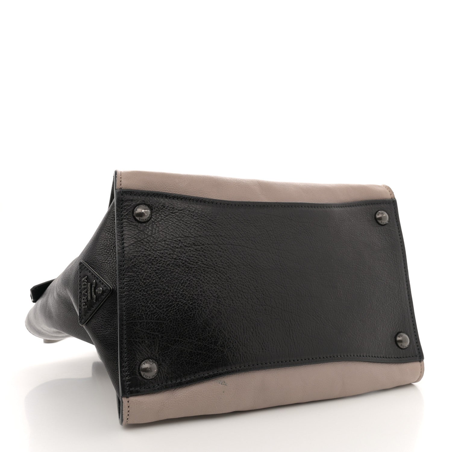 This is an authentic PRADA Glace Calfskin Sound Tote Bag in Pomice and Black. This stylish tote is beautifully crafted of luxurious glazed calfskin leather in black and beige. The bag features rolled leather top handles and an optional leather shoulder strap with silver clasps. The bag features a cross-over top that seals with a dark silver press-lock.