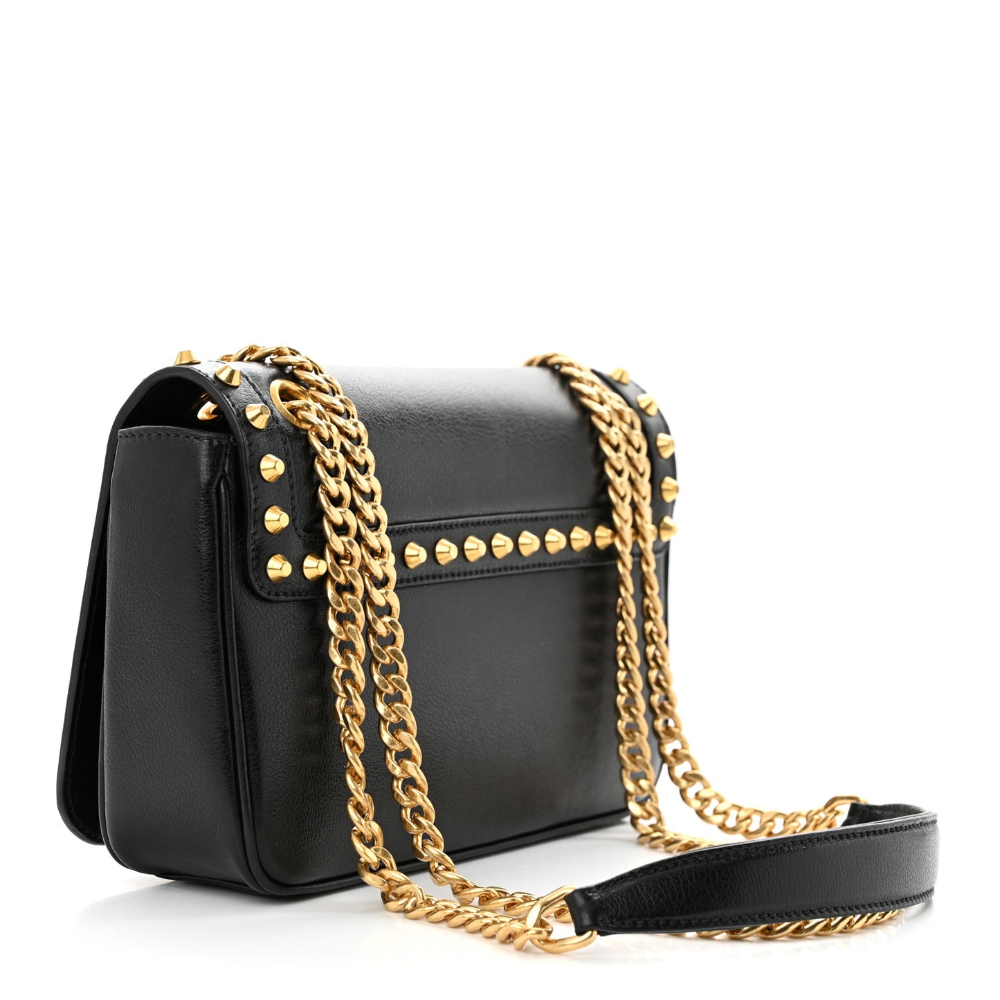 This is an authentic PRADA Glace Calfskin Studded Crossbody in Black. This chic shoulder bag is crafted of grained calfskin leather in black. This stylish crossbody bag features a long aged gold chain strap with a black leather shoulder pad, gold studs and a bold Prada logo. The top flap opens to a black Prada logo jacquard interior with zipper and flat pockets.Follow this item for alerts. Prada is a registered trademark of Prada. FASHIONPHILE is not affiliated with Prada.