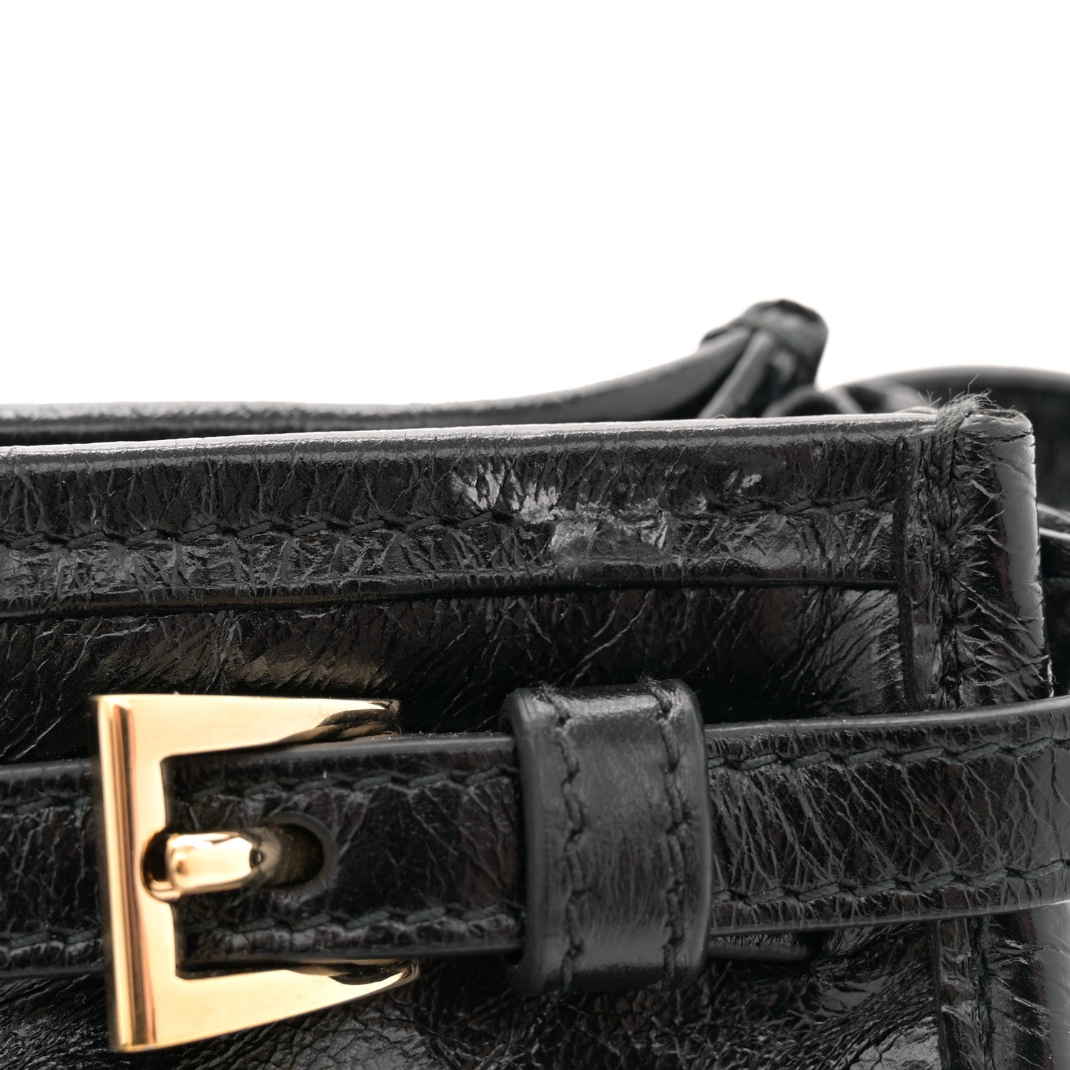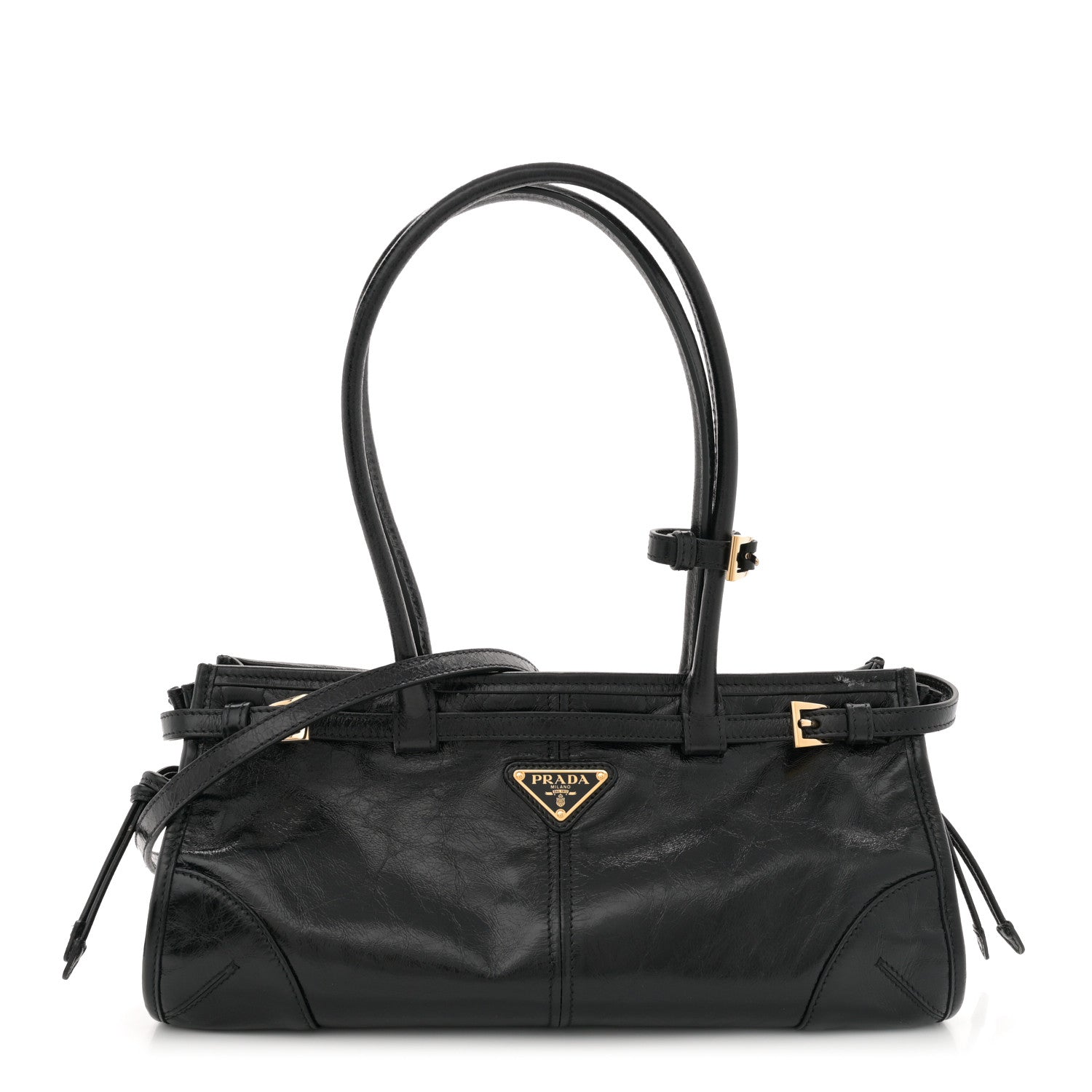 This is an authentic PRADA Glossy Calfskin Triangle Medium Bonnie Shoulder Bag in Black. This "east west" shoulder bag is crafted of glossy, crinkled calfskin leather in black. The bag features long leather shoulder straps, a removable adjustable crossbody strap, top accent belts and side cinch ties, and a triangle Prada logo at the front. The top zipper opens to a black Prada logo jacquard fabric interior with a zippered pocket.Follow this item for alerts. Prada is a registered trademark of Prada. FASHIONPHILE is not affiliated with Prada.