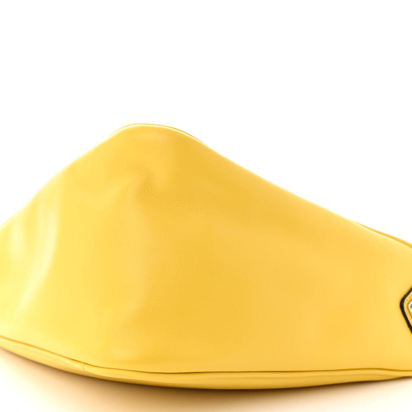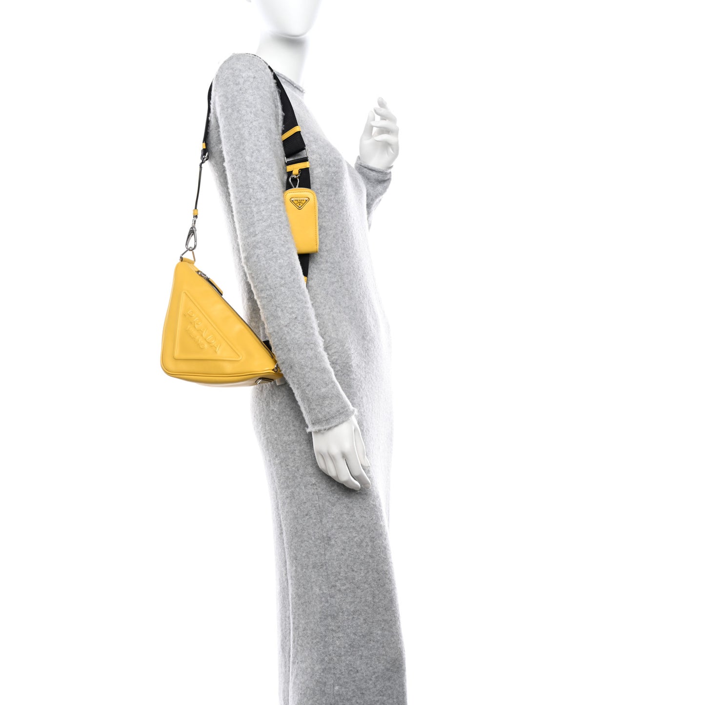 This is an authentic PRADA Grace Lux Triangle Shoulder Bag in Sole. This stylish triangle bag is crafted of yellow calfskin leather. The bag features an embossed Prada logo, a black nylon shoulder strap with a coin purse, and silver hardware. The top zipper opens to a black Prada logo jacquard interior.