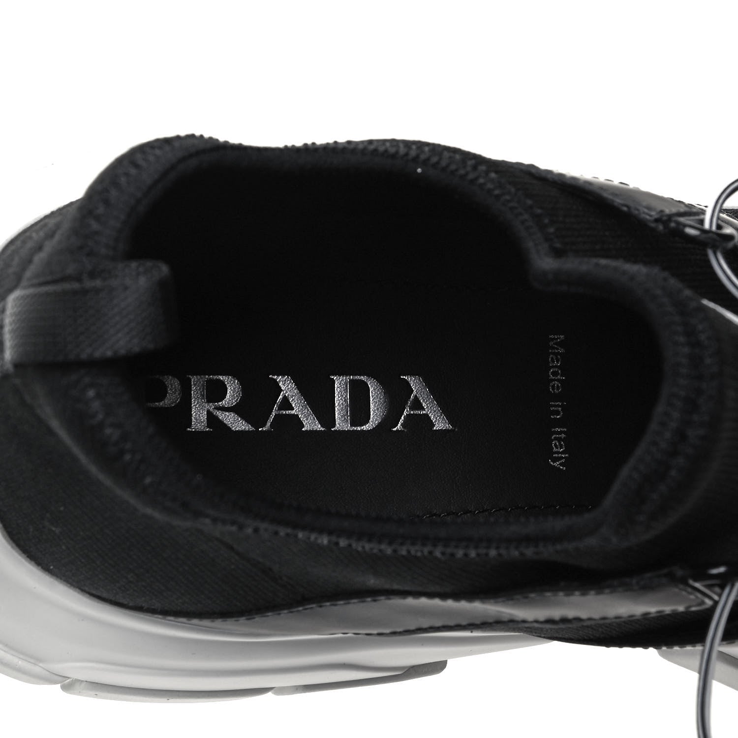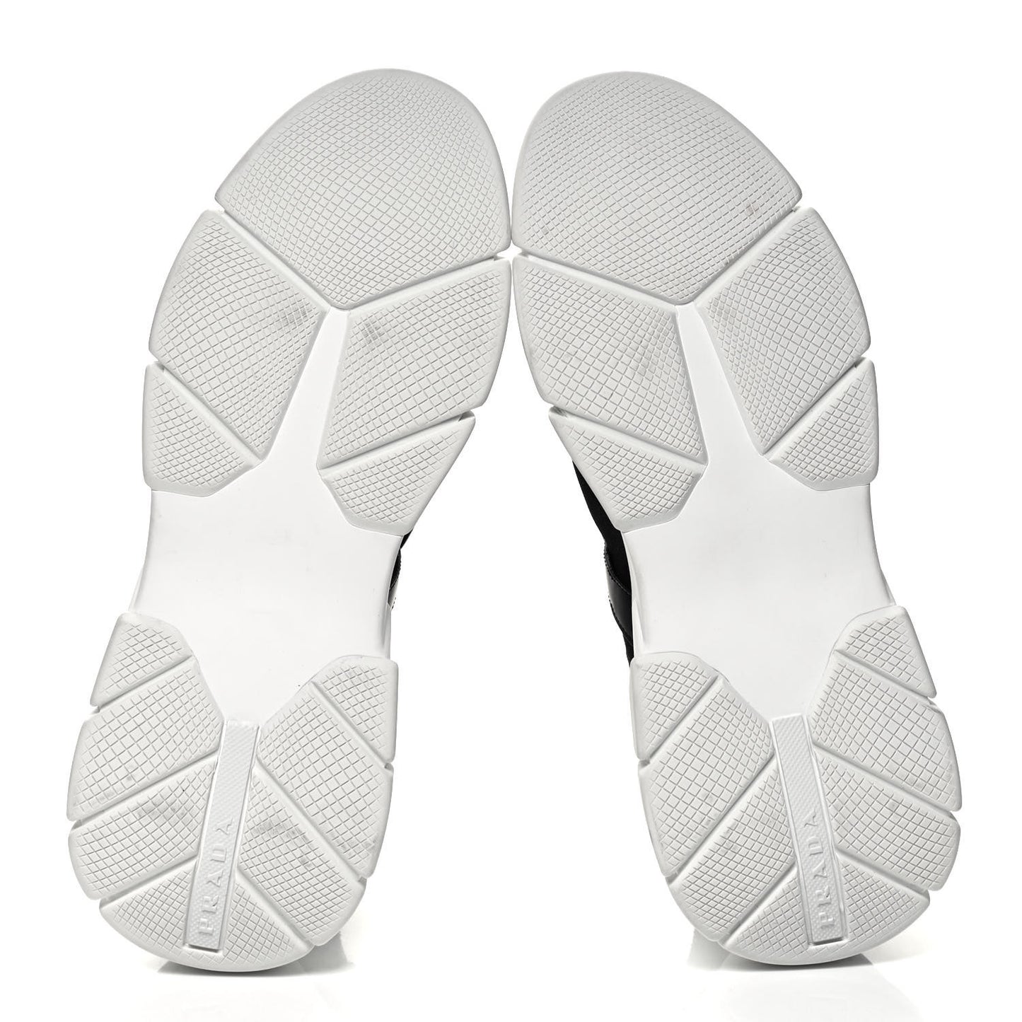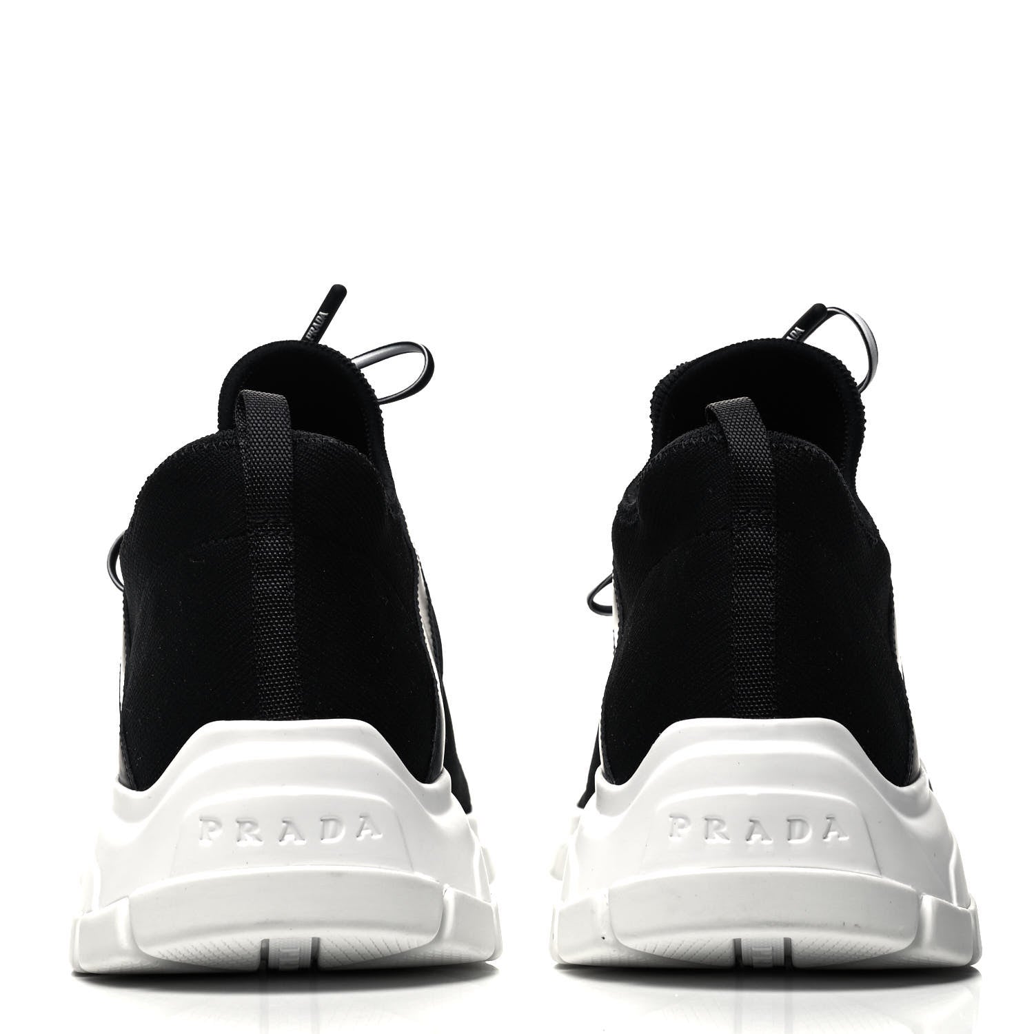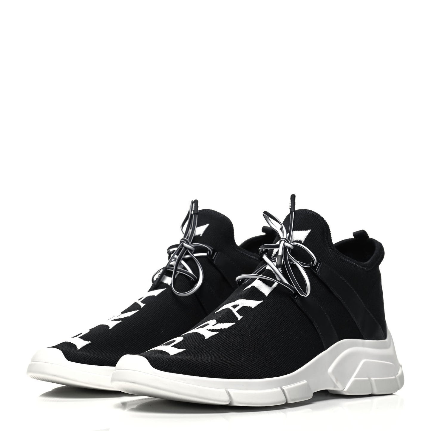 This is an authentic pair of PRADA Knit Fabric Mens Logo Sneakers size 7 in Black and White. They feature the Prada logo printed across the tops in white and matching white soles.Follow this item for alerts. Prada is a registered trademark of Prada. FASHIONPHILE is not affiliated with Prada.