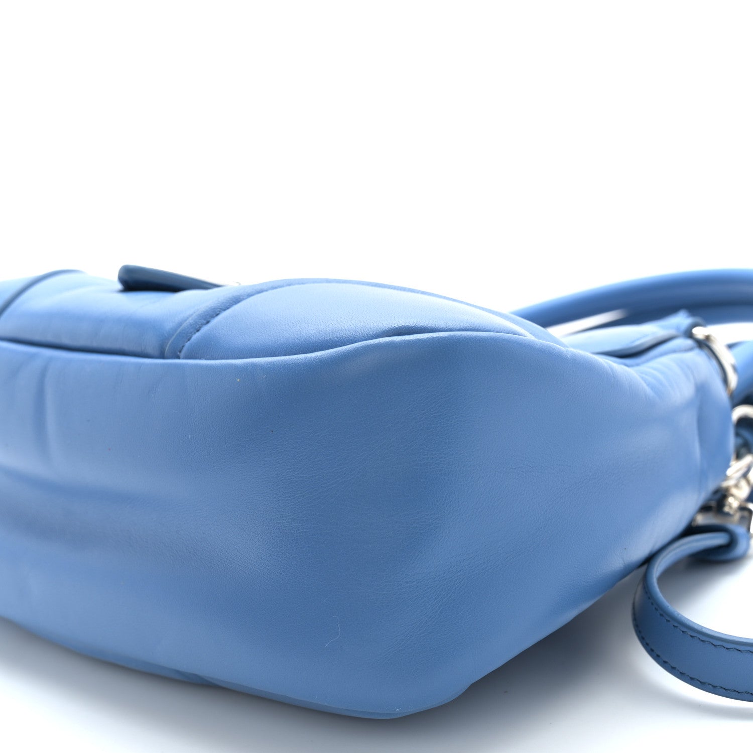 This is an authentic PRADA Nappa Soft Padded Re-Edition 2002 Moon Bag in Onda. This Prada handbag is crafted of light blue padded leather. The bag features a rolled leather top handles with silver hardware, and a crossover strap that secures with a magnetic closure. This bag opens to a matching leather interior with a zipper pocket.