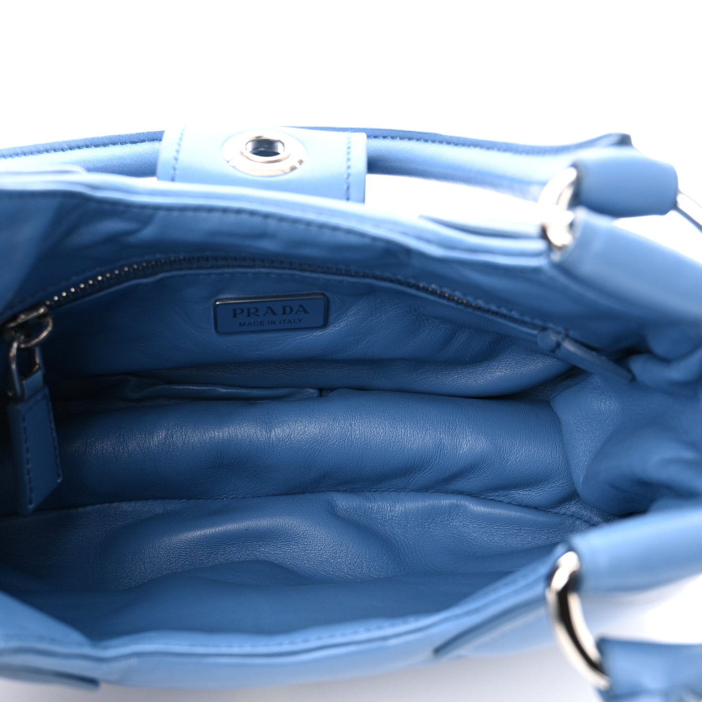 This is an authentic PRADA Nappa Soft Padded Re-Edition 2002 Moon Bag in Onda. This Prada handbag is crafted of light blue padded leather. The bag features a rolled leather top handles with silver hardware, and a crossover strap that secures with a magnetic closure. This bag opens to a matching leather interior with a zipper pocket.Follow this item for alerts. Prada is a registered trademark of Prada. FASHIONPHILE is not affiliated with Prada.