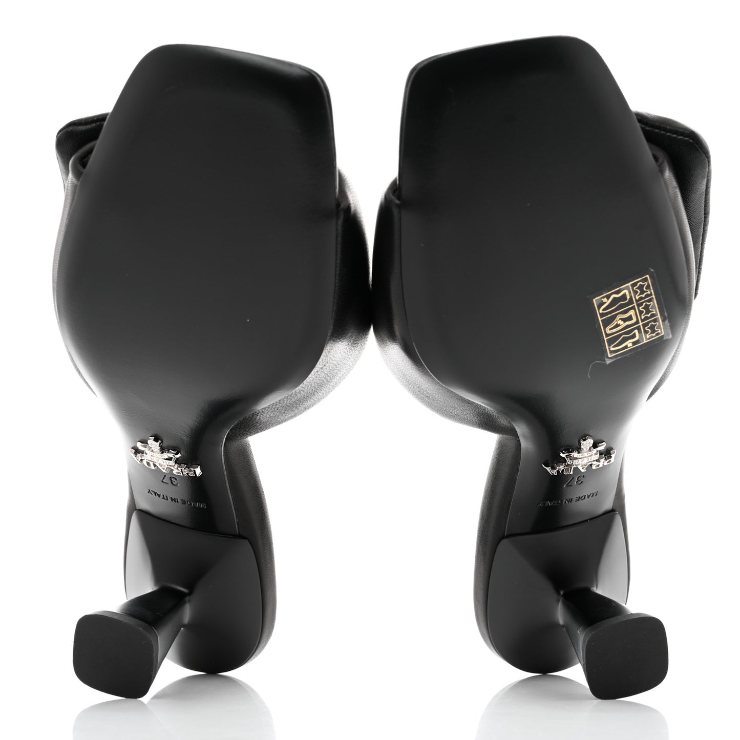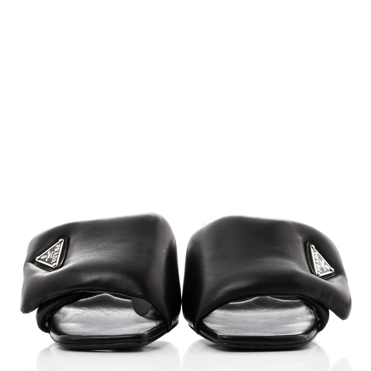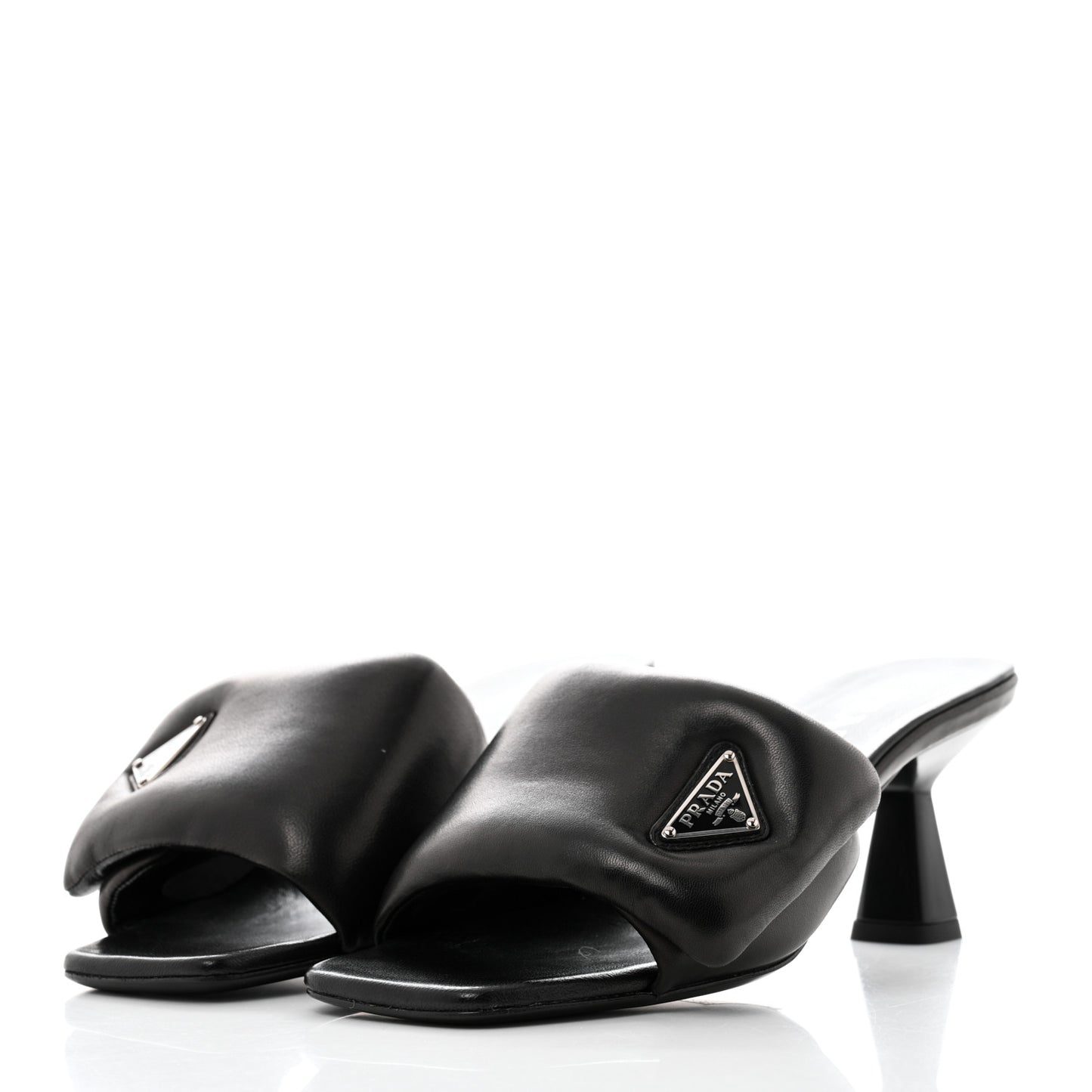 This is an authentic pair of PRADA Nappa Soft Padded Metal Triangle Logo 65mm Slide Sandals size 37 in Black. These mid-heel slides features soft nappa, metal lettering logo and leather soles. They feature a 2.5 inch heel lacquered heels.Follow this item for alerts. Prada is a registered trademark of Prada. FASHIONPHILE is not affiliated with Prada.
