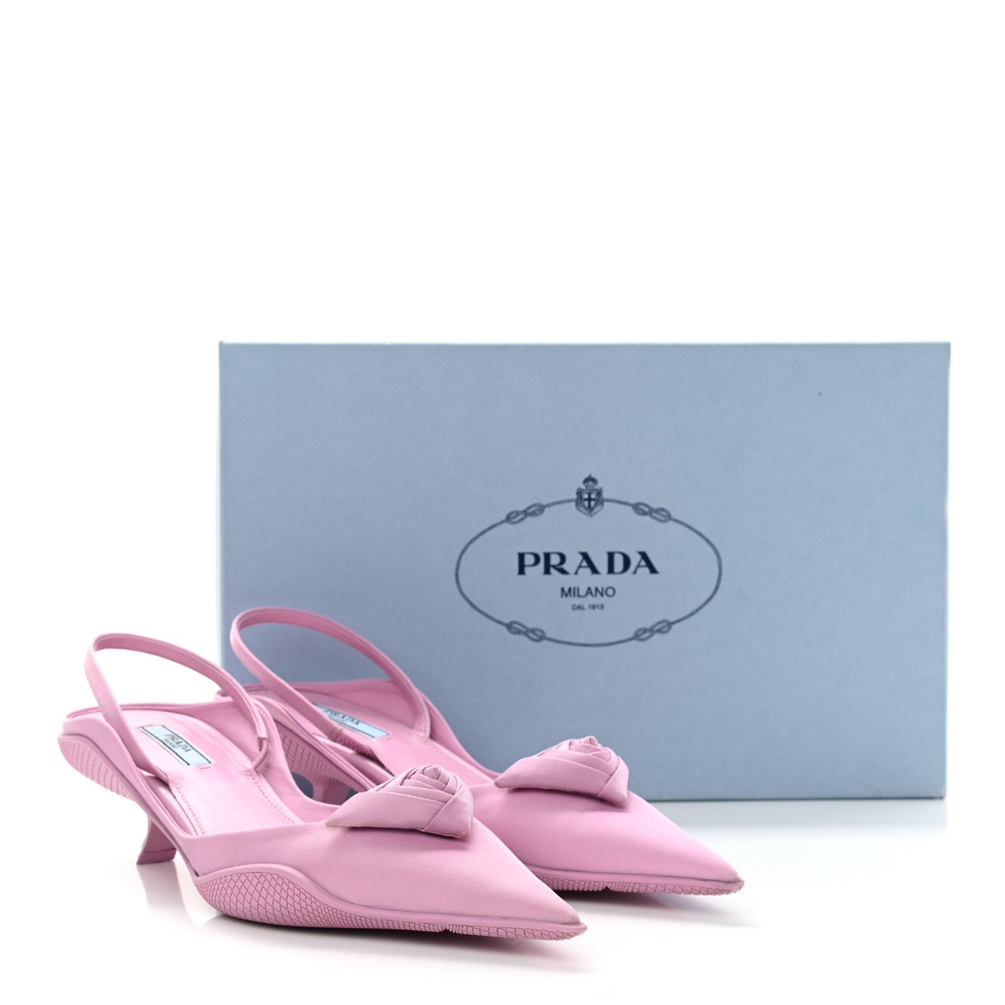 These are authentic pair of PRADA Nylon Flower Pointed Toe 45mm Slingback Pumps 38.5 Primula. These nylon and rubber slingback pumps feature a rose detail, elongated pointed toes, elasticized halter ankle straps, 45mm kitten heels, and rubber soles.Follow this item for alerts. Prada is a registered trademark of Prada. FASHIONPHILE is not affiliated with Prada.