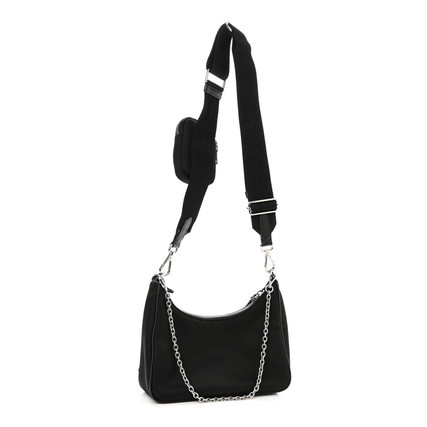 This is an authentic PRADA Nylon Re-Edition 2005 Shoulder Bag in Black. This petite messenger bag is crafted of fine nylon in black with matching black saffiano leather trim and silver hardware. The set features a silver chain-link strap, and a top zipper opens to a black Prada monogram jacquard fabric interior.