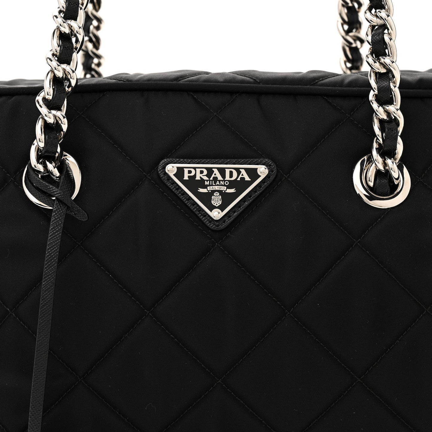 This is an authentic PRADA Nylon Tessuto Impuntu Quilted Shoulder Bag in Black. This stunning shoulder bag is beautifully crafted of black diamond quilted tessuto nylon. The bag features silver chain link shoulder straps threaded with leather and a Prada logo. The top zipper opens to a black Prada logo jacquard fabric interior with zipper and patch pockets.Follow this item for alerts. Prada is a registered trademark of Prada. FASHIONPHILE is not affiliated with Prada.