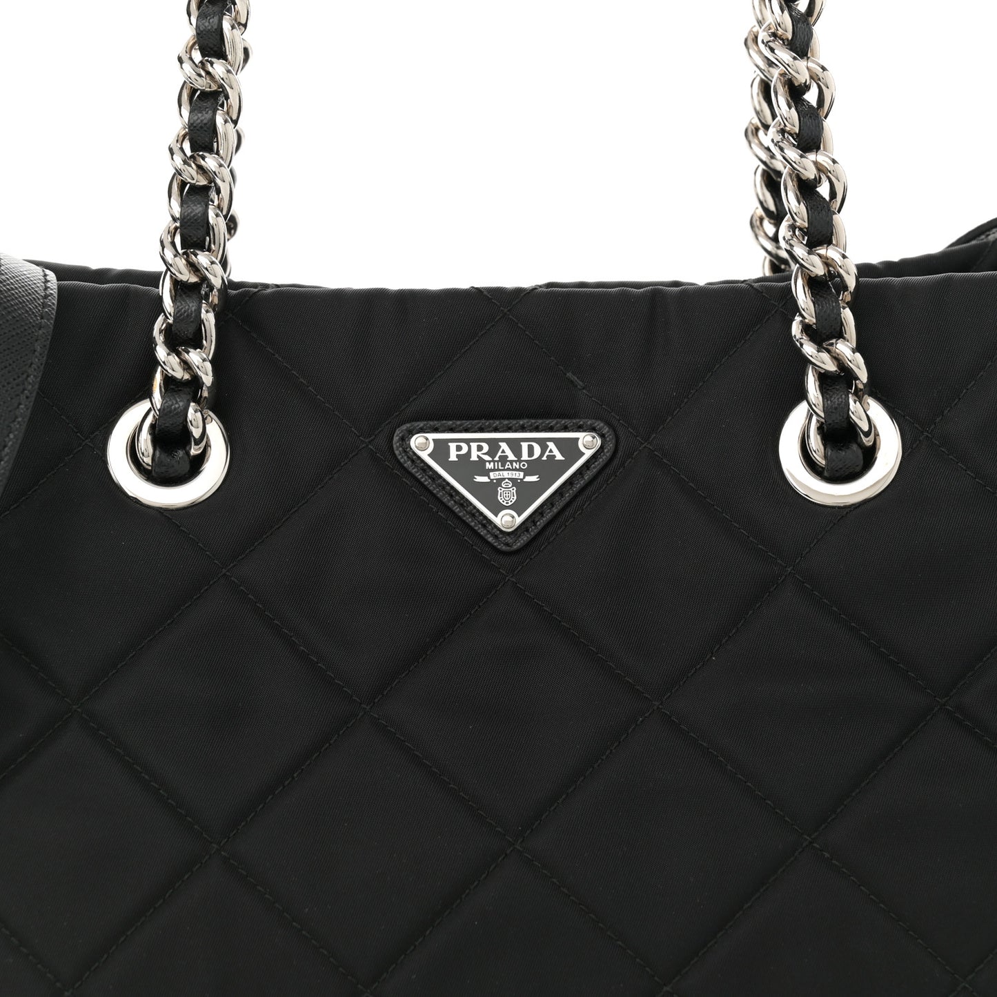 This is an authentic PRADA Nylon Tessuto Impuntu Quilted Tote in Black. This shoulder bag is crafted of black nylon with diamond quilting. The bag features leather-threaded silver chainlink shoulder straps with black leather shoulder pads and a Prada triangle logo on the front. The top zippers open to a black Prada logo jacquard fabric interior with zipper and patch pockets.Follow this item for alerts. Prada is a registered trademark of Prada. FASHIONPHILE is not affiliated with Prada.