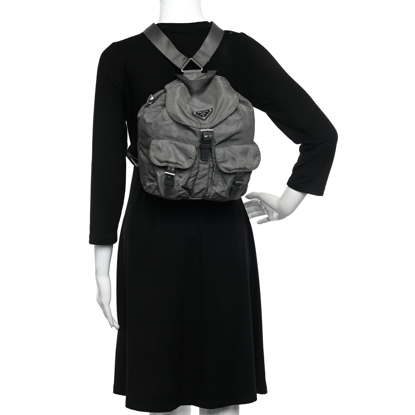 This is an authentic PRADA Nylon Vela Small Backpack in Anthracite. This chic backpack is crafted of fine durable nylon in gray and features a crossover top flap and two exterior pockets all with silver buckles and adjustable nylon shoulder straps. The top opens to a spacious black Prada logo jacquard interior with a zipper pocket.