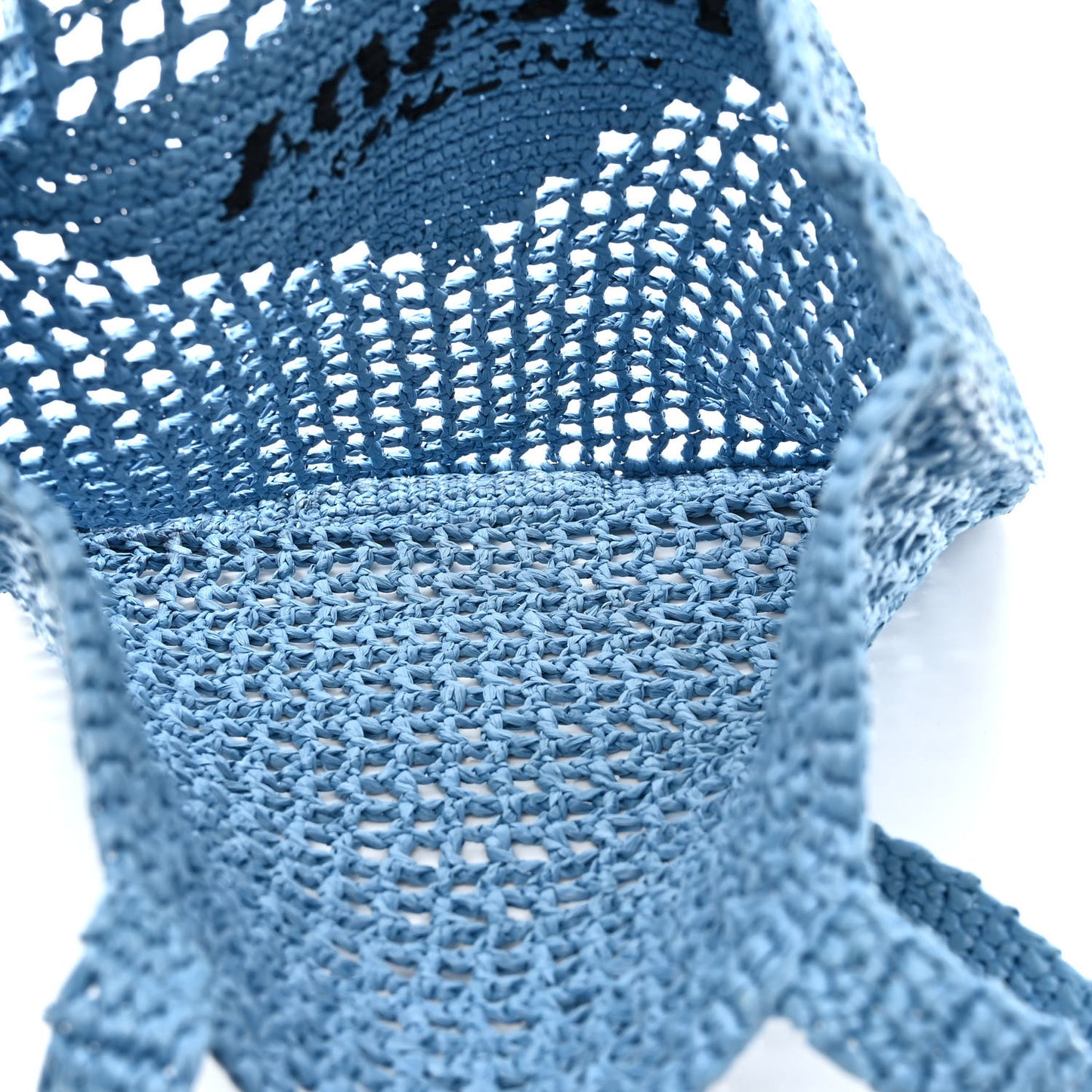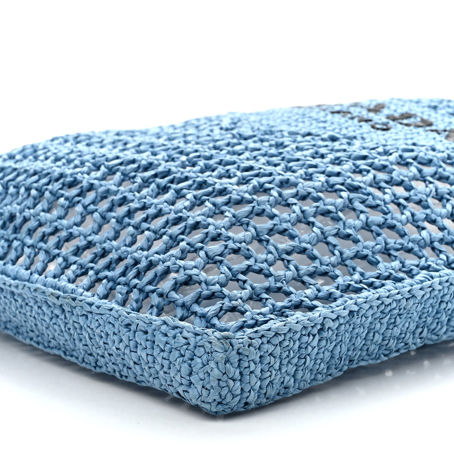 This is an authentic PRADA Yarn Raffia Effect Crochet Logo Embroidered Tote Bag in Celeste. This stylish tote is crafted of blue raffia. The bag features a black Prada logo on the front.Follow this item for alerts. Prada is a registered trademark of Prada. FASHIONPHILE is not affiliated with Prada.
