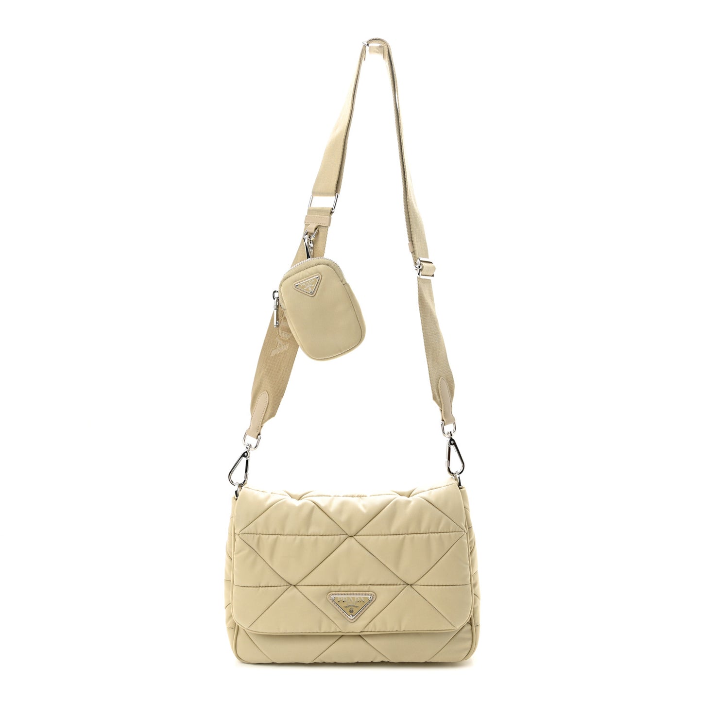This is an authentic PRADA Re-Nylon Quilted Padded Flap Shoulder Bag in Deserto. This chic shoulder bag is crafted of nylon quilted in beige. The set features an adjustable beige nylon shoulder strap, polished silver hardware, and a removable coin purse. The front flap opens to a zippered top and a beige Prada monogram jacquard fabric interior with zipper and patch pockets.Follow this item for alerts. Prada is a registered trademark of Prada. FASHIONPHILE is not affiliated with Prada.