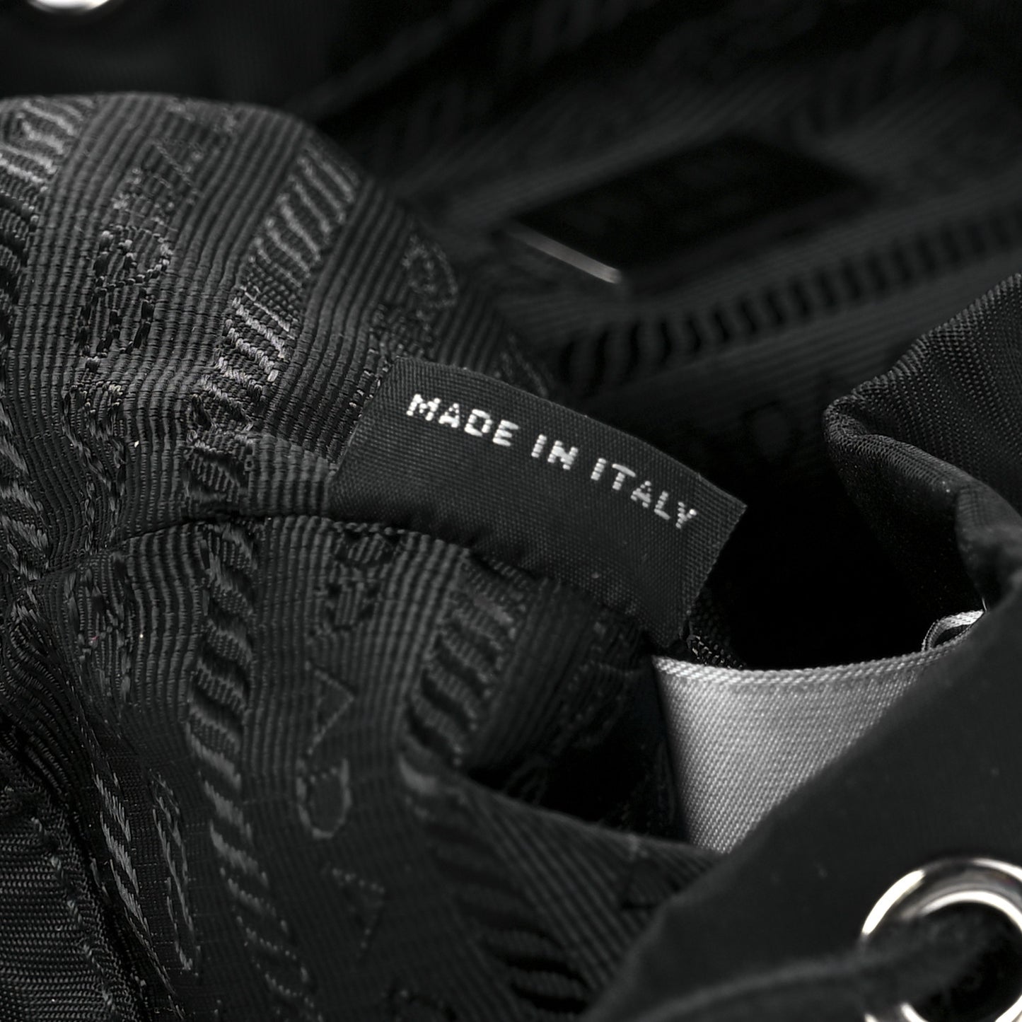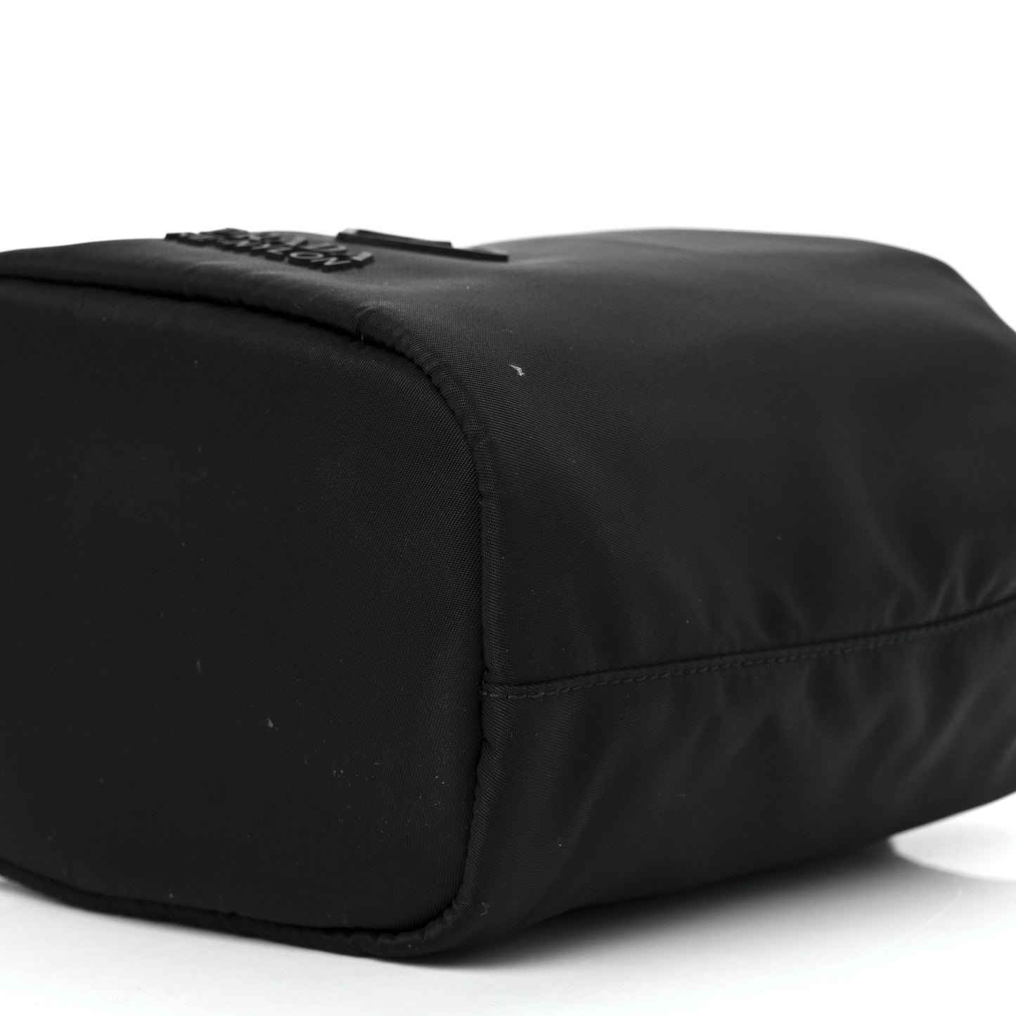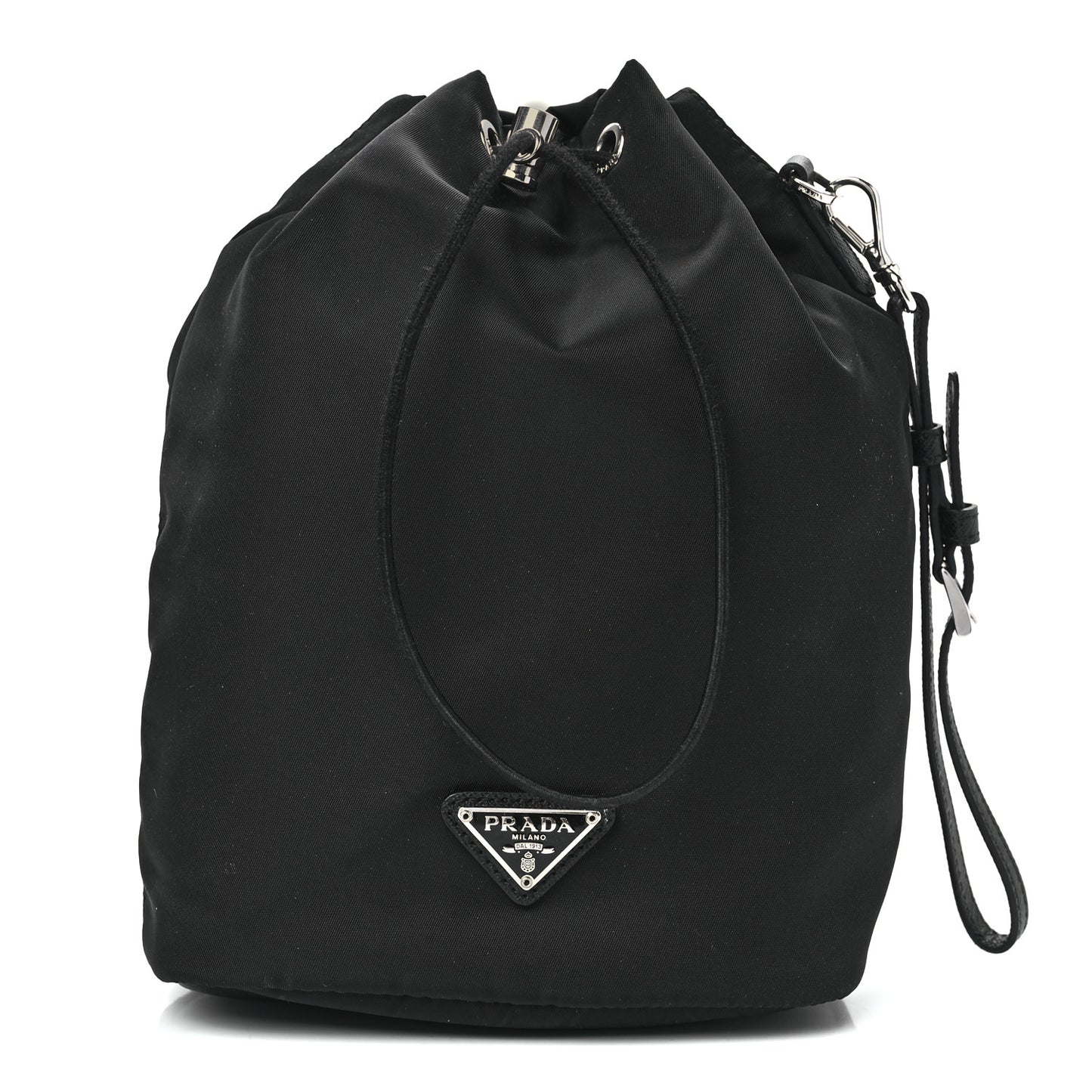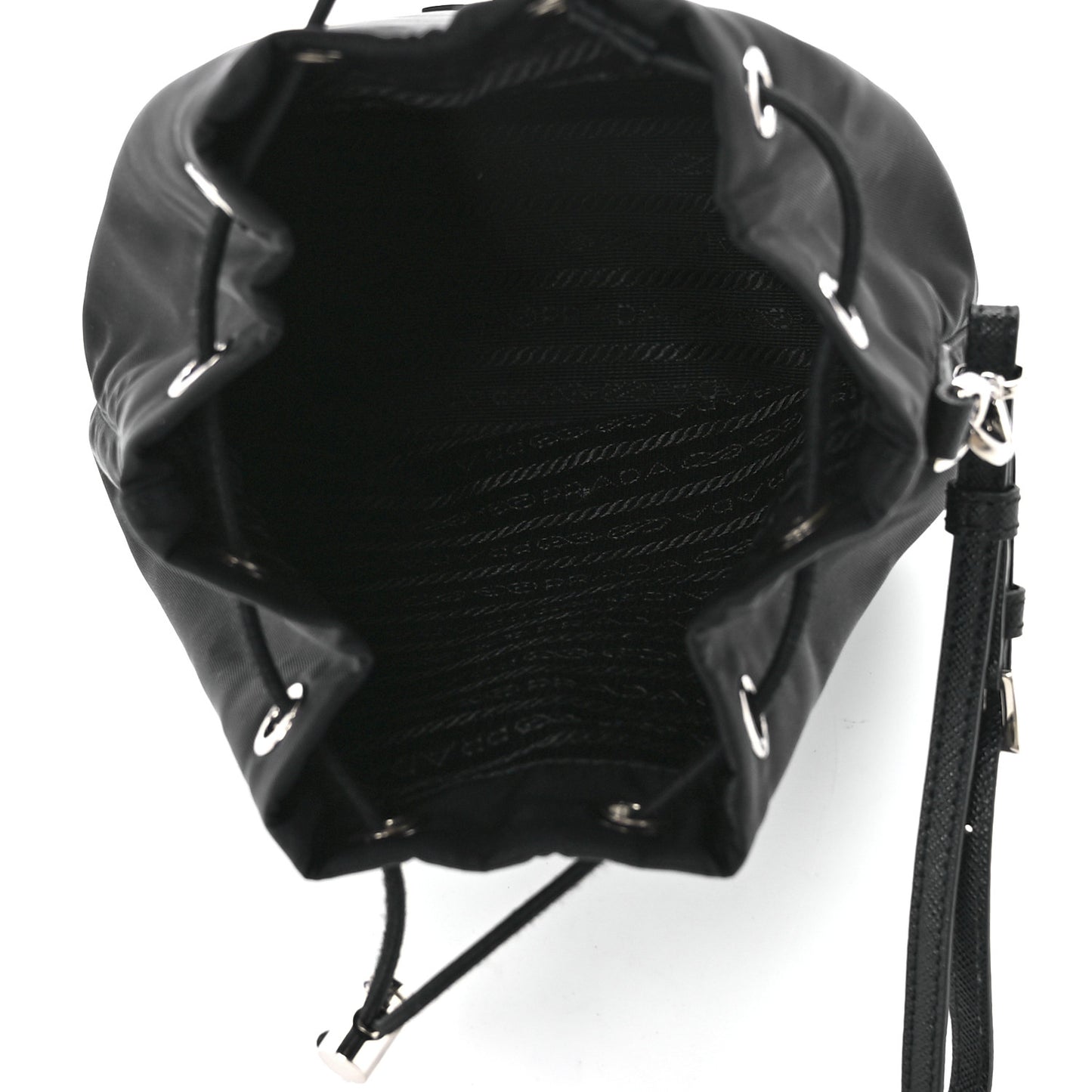 This is an authentic PRADA Re-Nylon Saffiano Bucket Wristlet in Black. This chic bag is crafted of nylon in black. The bag features a top cinch cord and an optional, adjustable black leather wristlet strap with polished silver hardware. The top is open to a black nylon interior.Follow this item for alerts. Prada is a registered trademark of Prada. FASHIONPHILE is not affiliated with Prada.