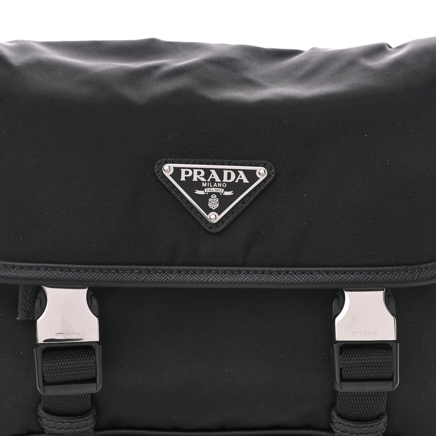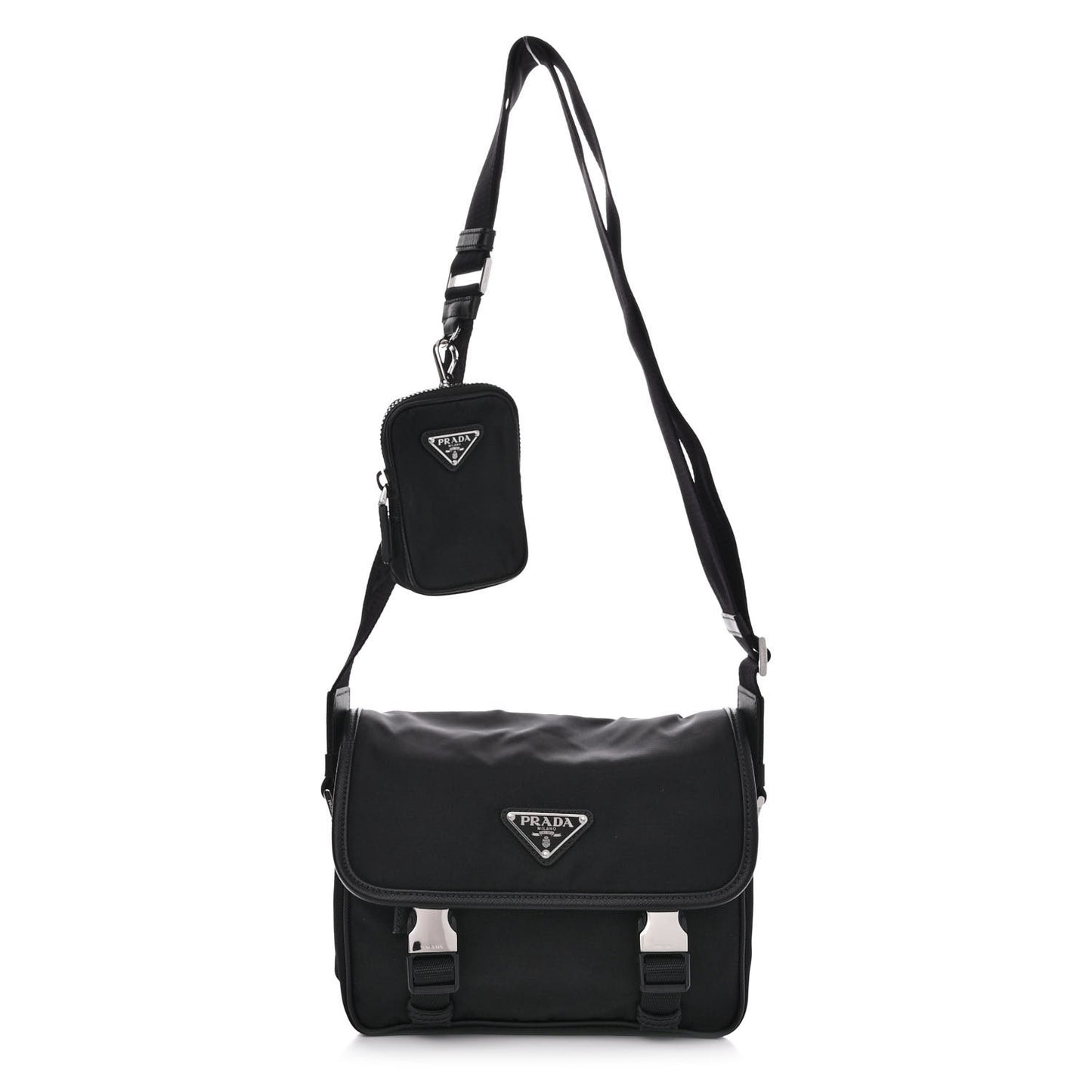 This is an authentic PRADA Re-Nylon Saffiano Pocket Double Snap Buckle Shoulder Bag in Black. This petite shoulder bag is crafted of fine black nylon with polished silver hardware. It features Saffiano cross-grain leather trim, an adjustable nylon crossbody strap, front flap pocket, and a removable pouch. The top zipper opens to a Prada monogram jacquard interior.Follow this item for alerts. Prada is a registered trademark of Prada. FASHIONPHILE is not affiliated with Prada.