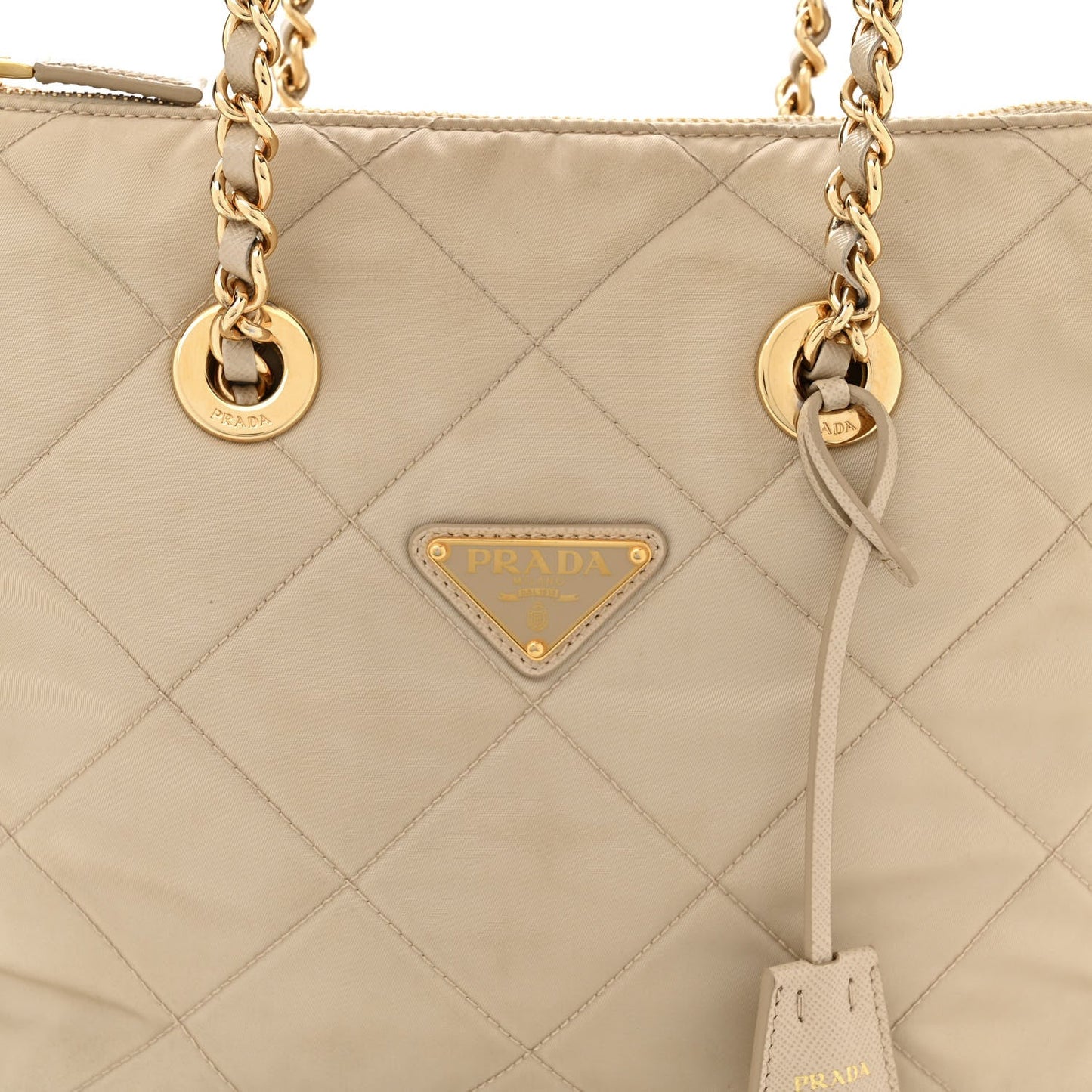 This is an authentic PRADA Re-Nylon Saffiano Stitched Re-Edition 1995 Chaine Tote Bag in Desert Beige. This chic tote is crafted of lightly padded recycled nylon in beige with geometric stitching. The bag features saffiano leather-threaded gold chain link shoulder straps and a prominent Prada triangle hardware logo on the front. The top zipper opens to a beige Prada logo-printed recycled nylon interior with a zippered pocket.Follow this item for alerts. Prada is a registered trademark of Prada. FASHIONPHILE is not affiliated with Prada.