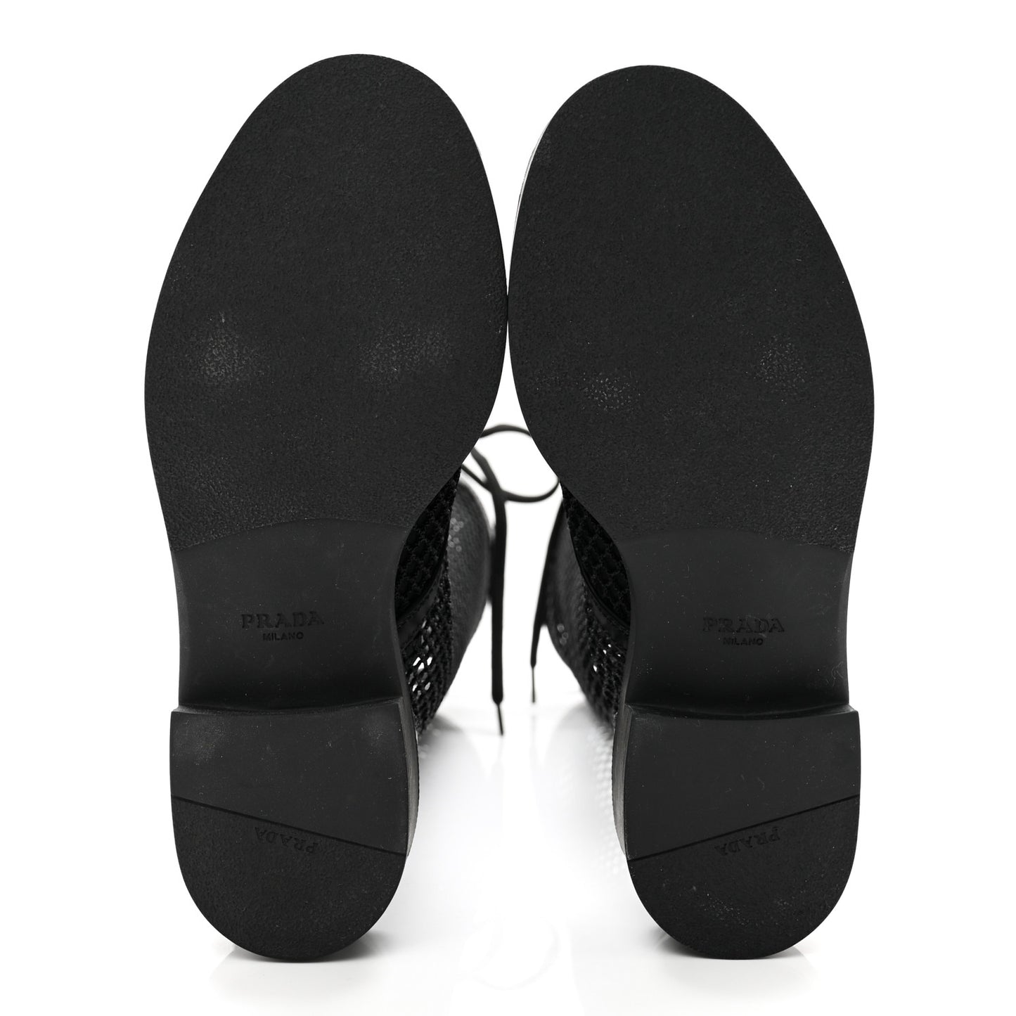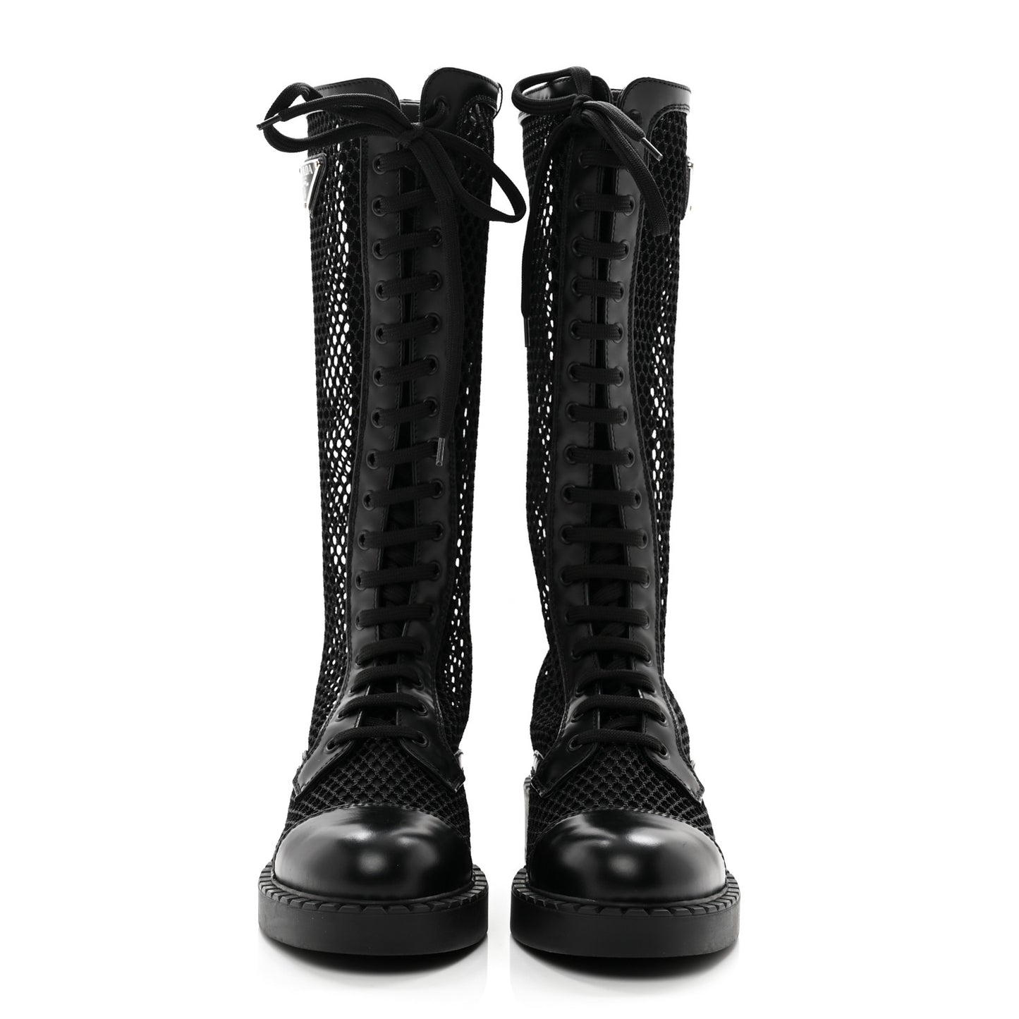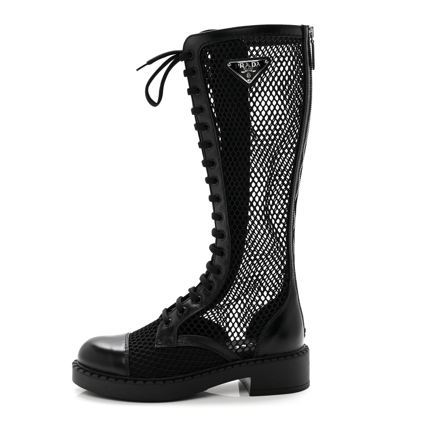 This is an authentic pair of PRADA Rete Spazzolato Rois Metal Triangle Logo Womens Knee High 50mm Boots size 35.5 in Black. These boots crafted of black mesh and matching leather. These boots features a round toe and a 1.5-inch stacked heel.Follow this item for alerts. Prada is a registered trademark of Prada. FASHIONPHILE is not affiliated with Prada.
