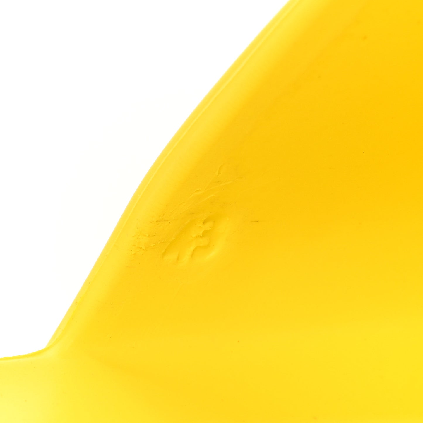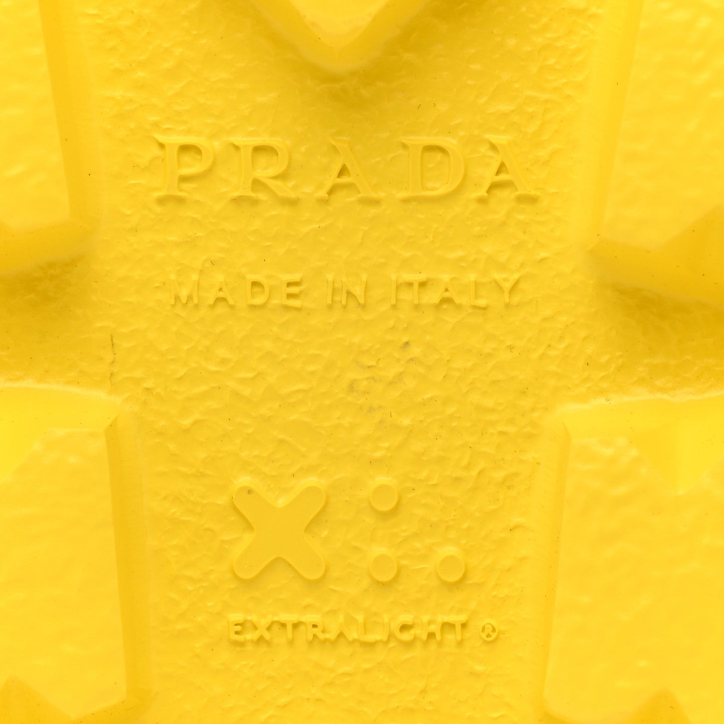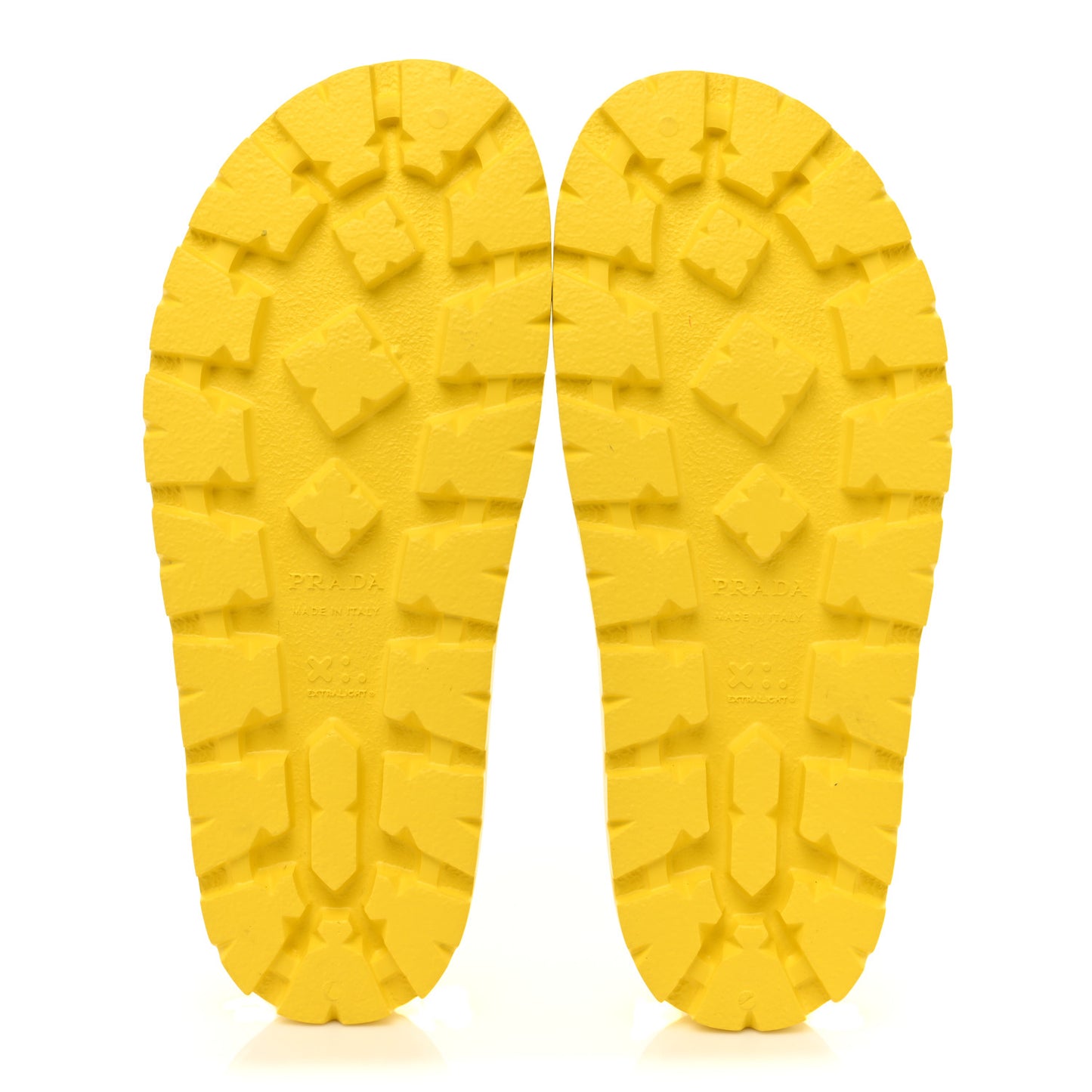This is an authentic pair of PRADA EVA Rubber Triangle Logo Embossed Mens Lug Sole Slide Sandals size 10 in Sole. These stylish sandals are crafted of yellow rubber.
