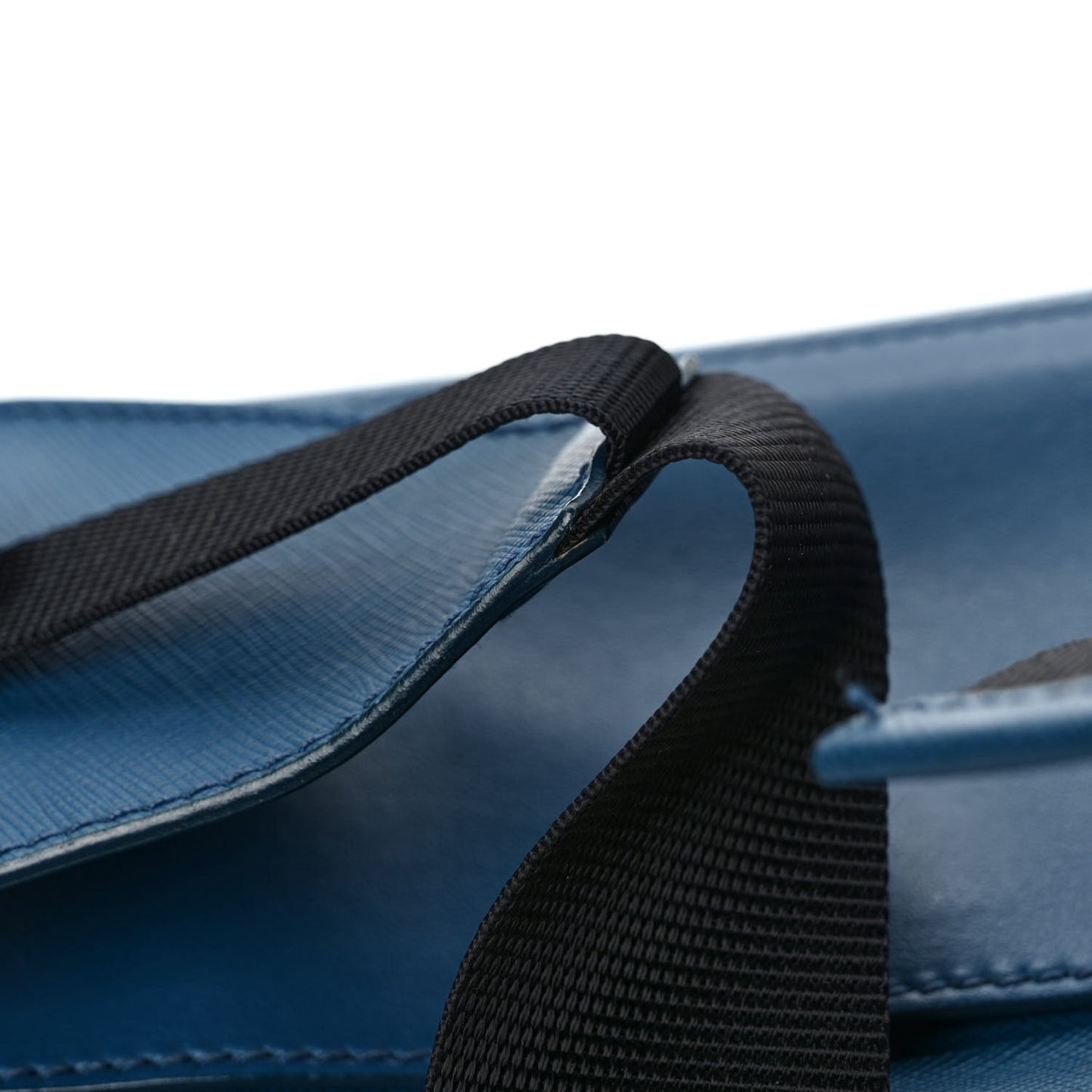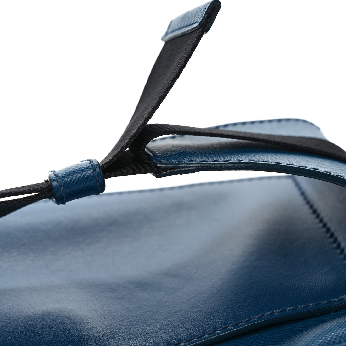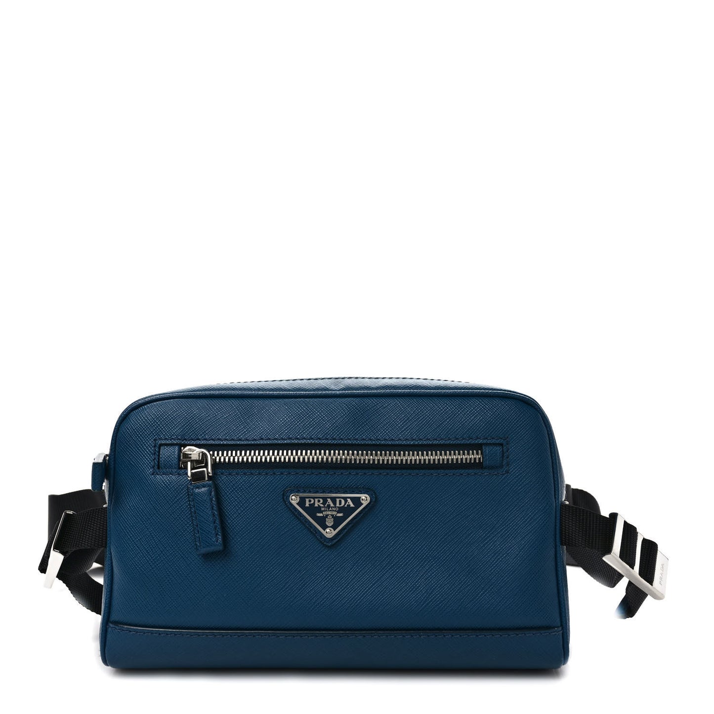 This is an authentic PRADA Saffiano Belt Bag in Oceano. This bag is crafted of saffiano leather in blue. This shoulder bag features an adjustable black nylon strap, a front zipper pocket and a PRADA logo on the front. The zipper opens to a black logo jacquard interior with a zipper pocket.Follow this item for alerts. Prada is a registered trademark of Prada. FASHIONPHILE is not affiliated with Prada.