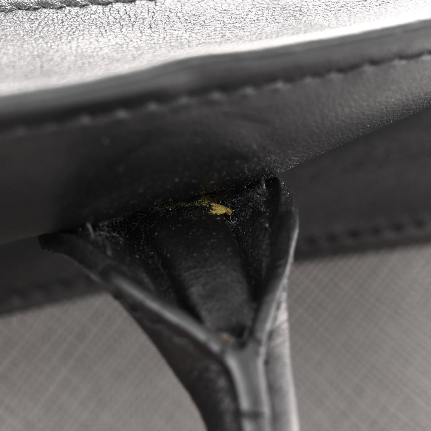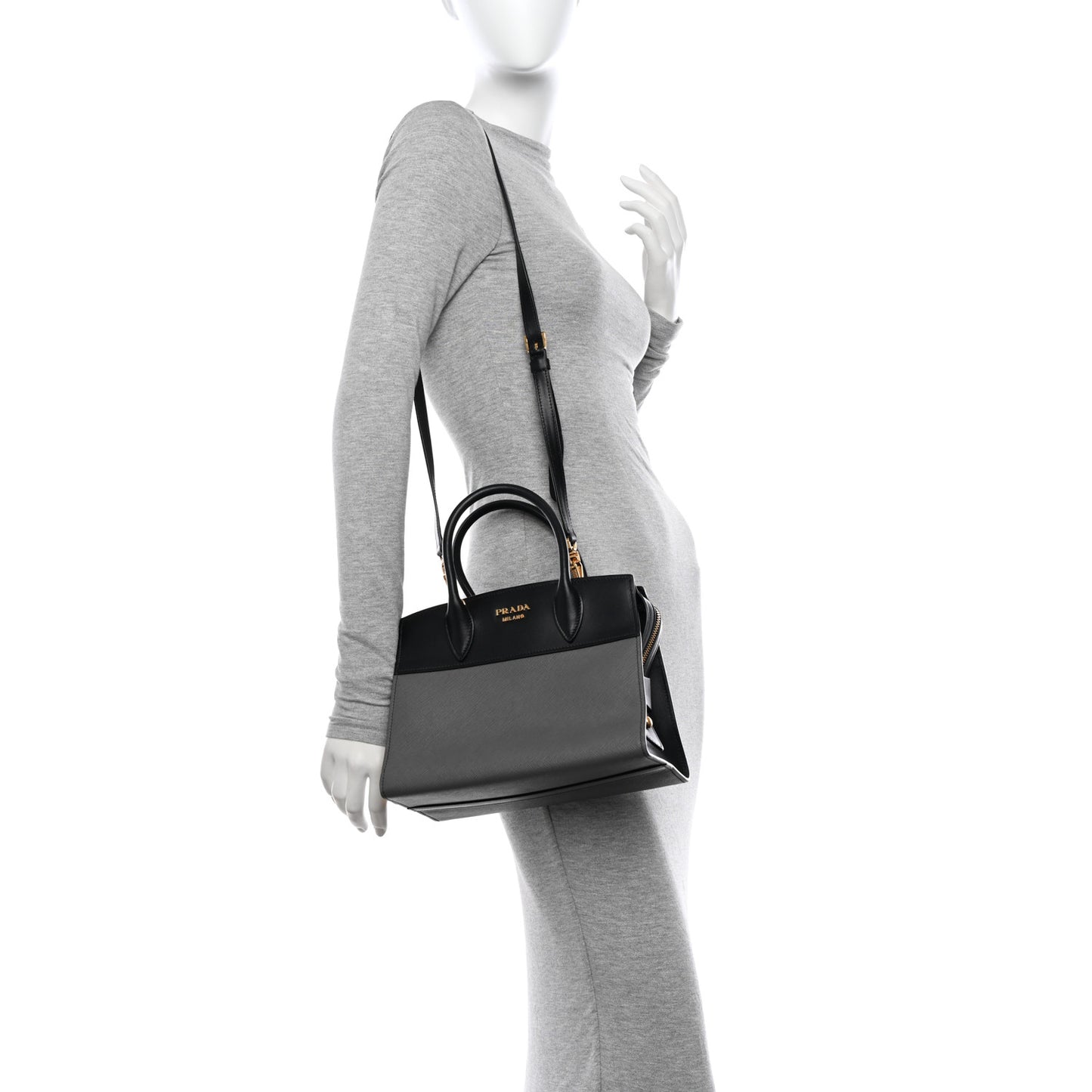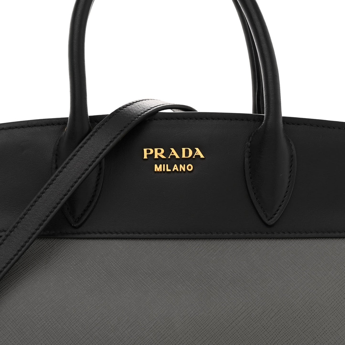 This is an authentic PRADA Saffiano City Calfskin Small Esplanade Tote in Mercurio and Black. This chic tote is crafted of Saffiano cross grain leather in grey. The bag features black leather trim, rolled leather top handles and an adjustable shoulder strap. The top zipper opens to a Prada jacquard fabric interior with zipper and patch pockets.Follow this item for alerts. Prada is a registered trademark of Prada. FASHIONPHILE is not affiliated with Prada.