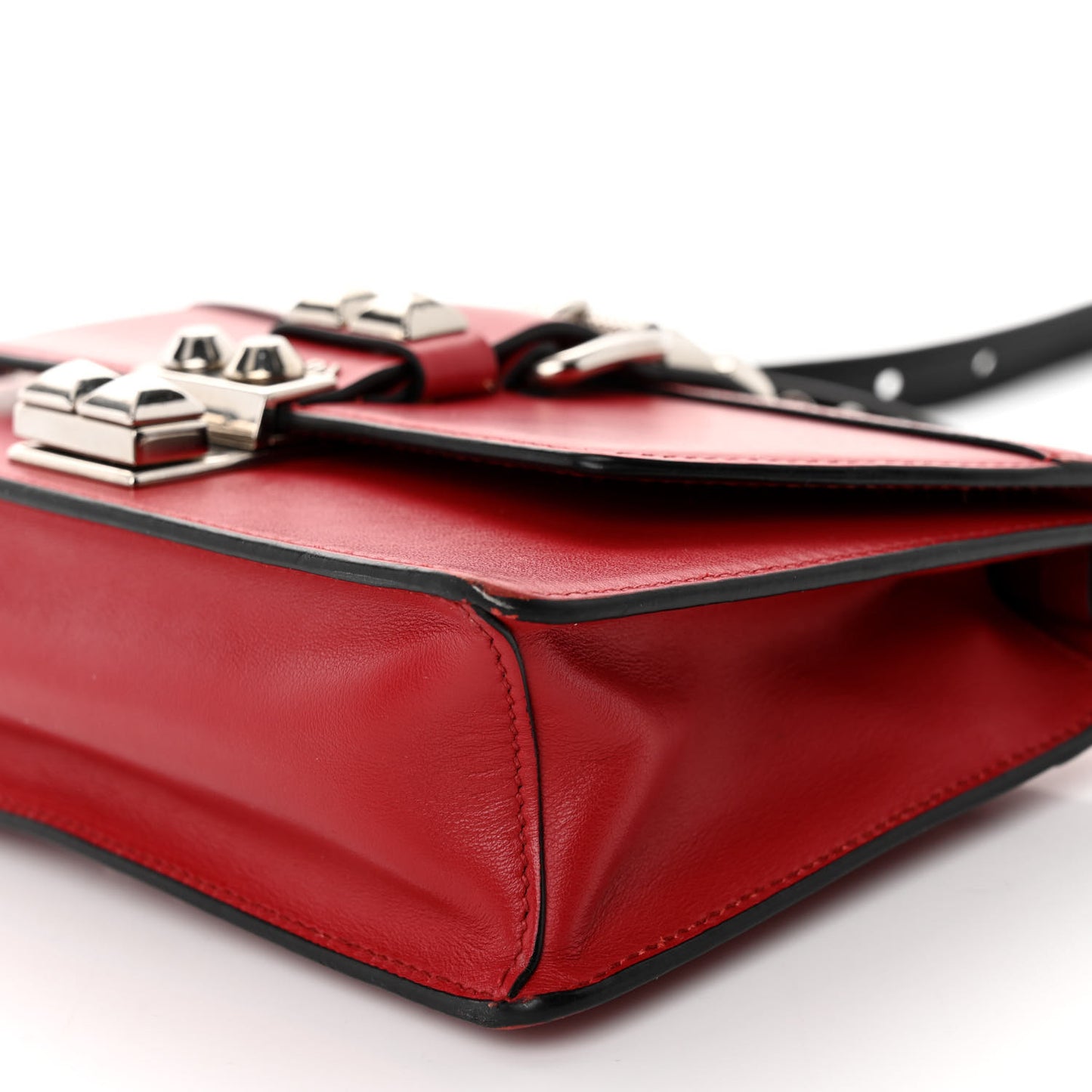 This is an authentic PRADA Saffiano City Calfskin Studded Large Elektra Shoulder Bag in Fuoco and Black. This chic cross-body bag is crafted of calfskin leather in red. The bag features an extra-long adjustable crossbody strap, polished silver buckle and clasps, and a studded accent strip in red and black bordering the top of the bag. The front push lock opens to a red leather and black Prada logo jacquard interior with pockets.Follow this item for alerts. Prada is a registered trademark of Prada. FASHIONPHILE is not affiliated with Prada.
