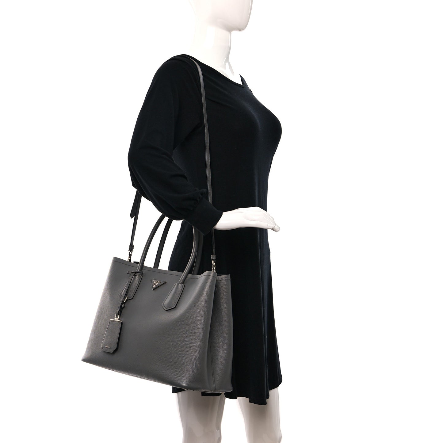 This is an authentic PRADA Saffiano Cuir Large Double Bag in Marmo. This stylish tote is beautifully crafted of luxurious saffiano cross grain leather in grey. The shoulder bag features rolled leather top handles, an optional shoulder strap and polished silver hardware. The bag opens to a black partitioned leather interior with a central divider with zipper and patch pockets adding the perfect touch of stylish sophistication from Prada!Follow this item for alerts. Prada is a registered trademark of Prada. FASHIONPHILE is not affiliated with Prada.