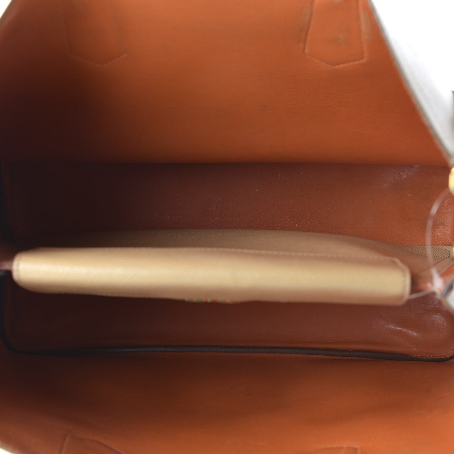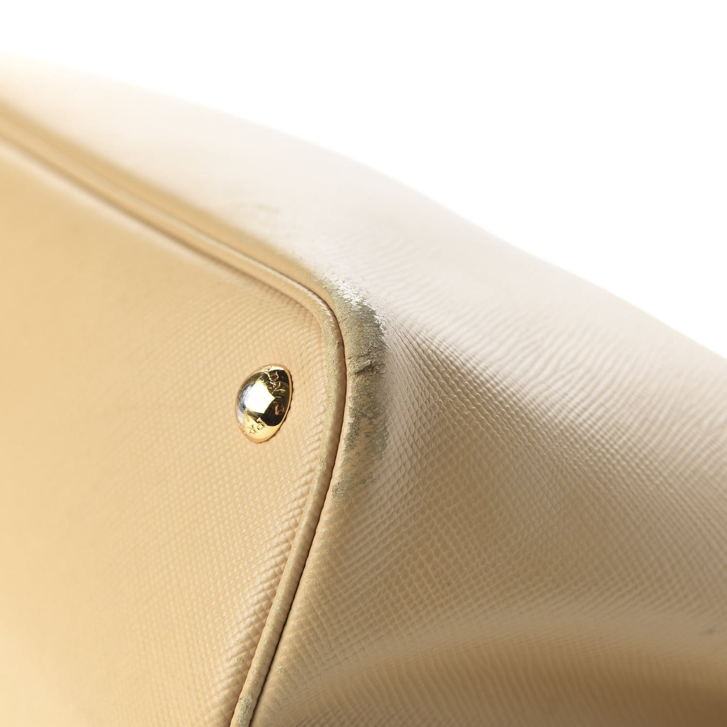 This is an authentic PRADA Saffiano Cuir Medium Double Bag in Noisette Papaya. This bold tote is crafted of Prada Saffiano cross-grain leather in beige. The bag features rolled leather top handles, an optional shoulder strap, expandable snap sides and polished gold hardware. The top is open to a partitioned papaya orange leather interior with a central flap compartment. This tote is ideal for everyday wear, only from Prada!Follow this item for alerts. Prada is a registered trademark of Prada. FASHIONPHILE is not affiliated with Prada.