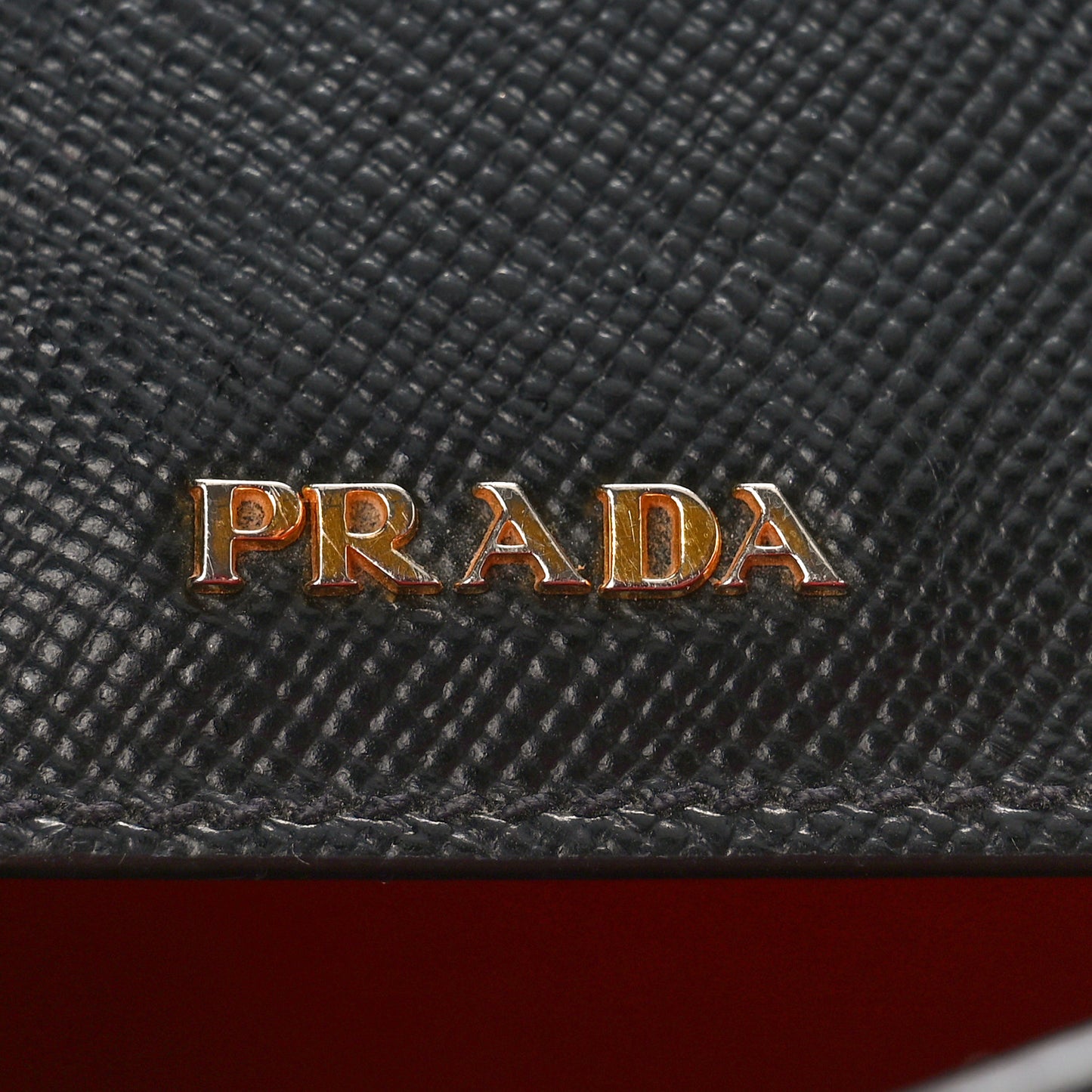 This is an authentic PRADA Saffiano Cuir Small Double Bag in Black and Fuoco. This bold tote is crafted of signature Prada saffiano cross-grain leather in black. The bag features rolled leather top handles, an optional shoulder strap, and polished gold-tone hardware. The top is open to a partitioned smooth red leather interior with a central flap pocket.Follow this item for alerts. Prada is a registered trademark of Prada. FASHIONPHILE is not affiliated with Prada.
