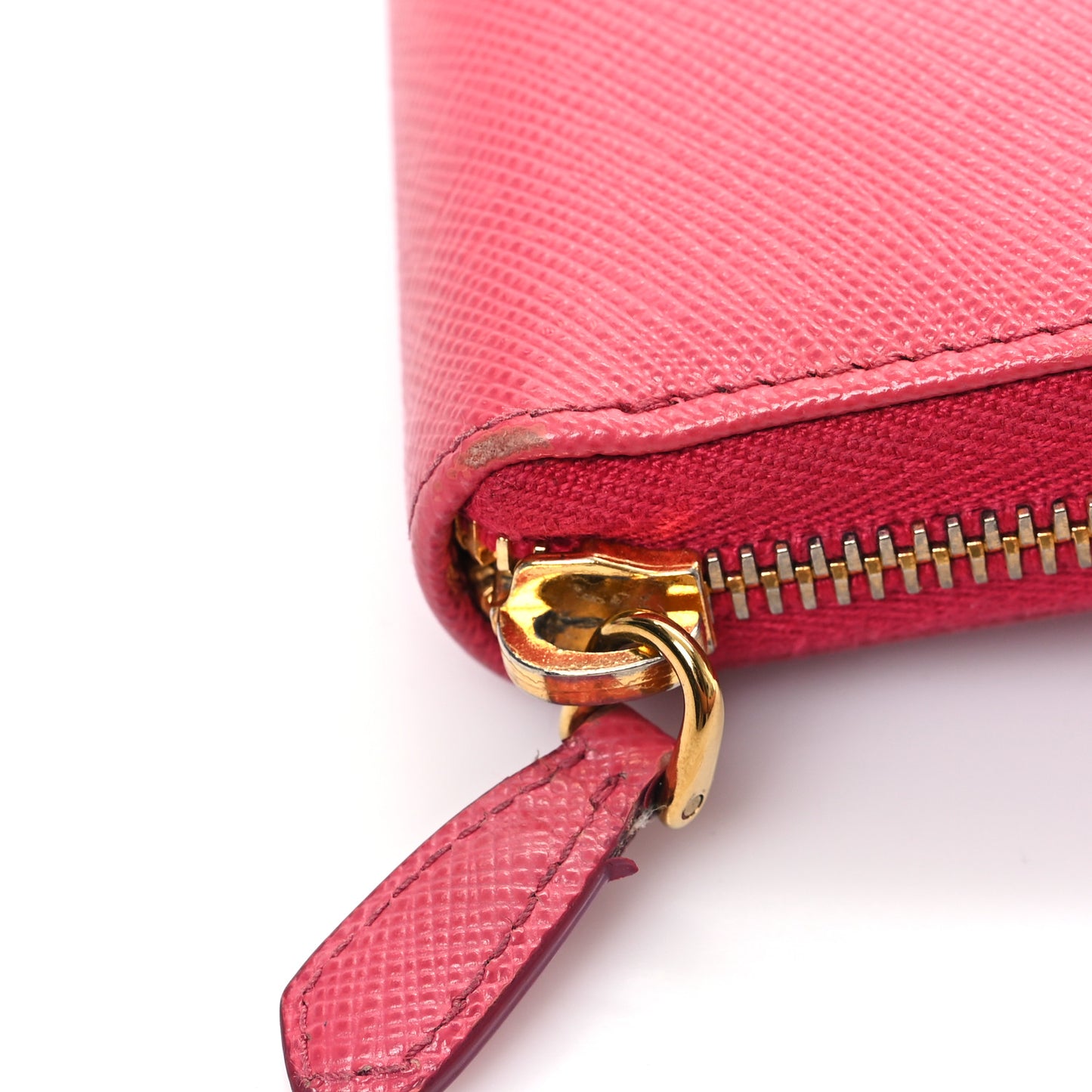 This is an authentic PRADA Saffiano Fiocco Bow Zip Around Wallet in Peonia. This stylish wallet is finely crafted of signature Saffiano cross grain leather in pink with a structured bow accent. The top 3/4 zipper opens to a matching partitioned leather interior with a central zipper compartment, card slots, and flat pockets.Follow this item for alerts. Prada is a registered trademark of Prada. FASHIONPHILE is not affiliated with Prada.