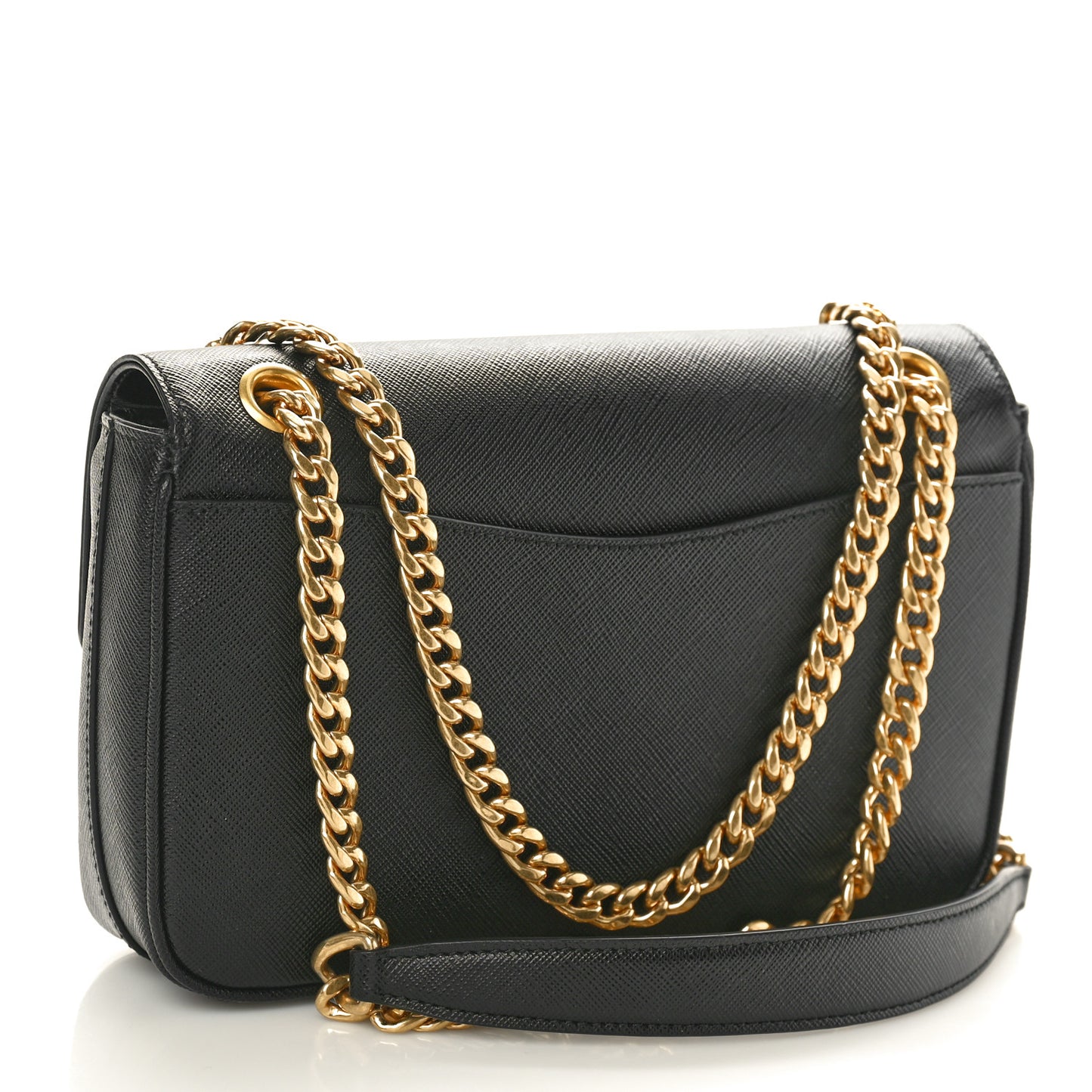 This is an authentic PRADA Saffiano Flap Shoulder Bag in Black. This chic shoulder bag is crafted of grained calfskin leather in black. The bag features a long gold chain shoulder strap with a leather shoulder pad and a crossover flap with a metal Prada logo. this opens to a black jacquard logo fabric interior with zipper and patch pockets.Follow this item for alerts. Prada is a registered trademark of Prada. FASHIONPHILE is not affiliated with Prada.