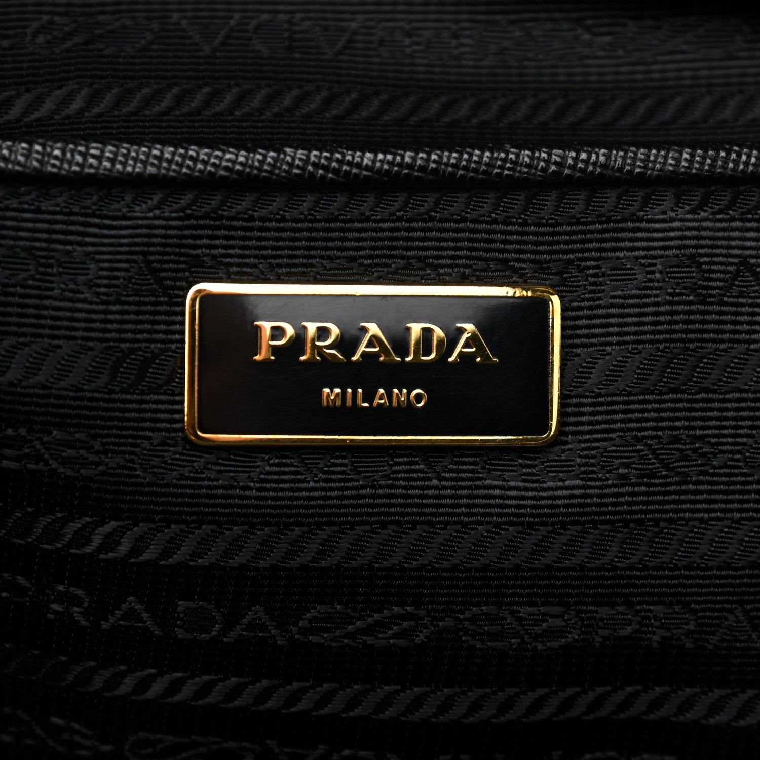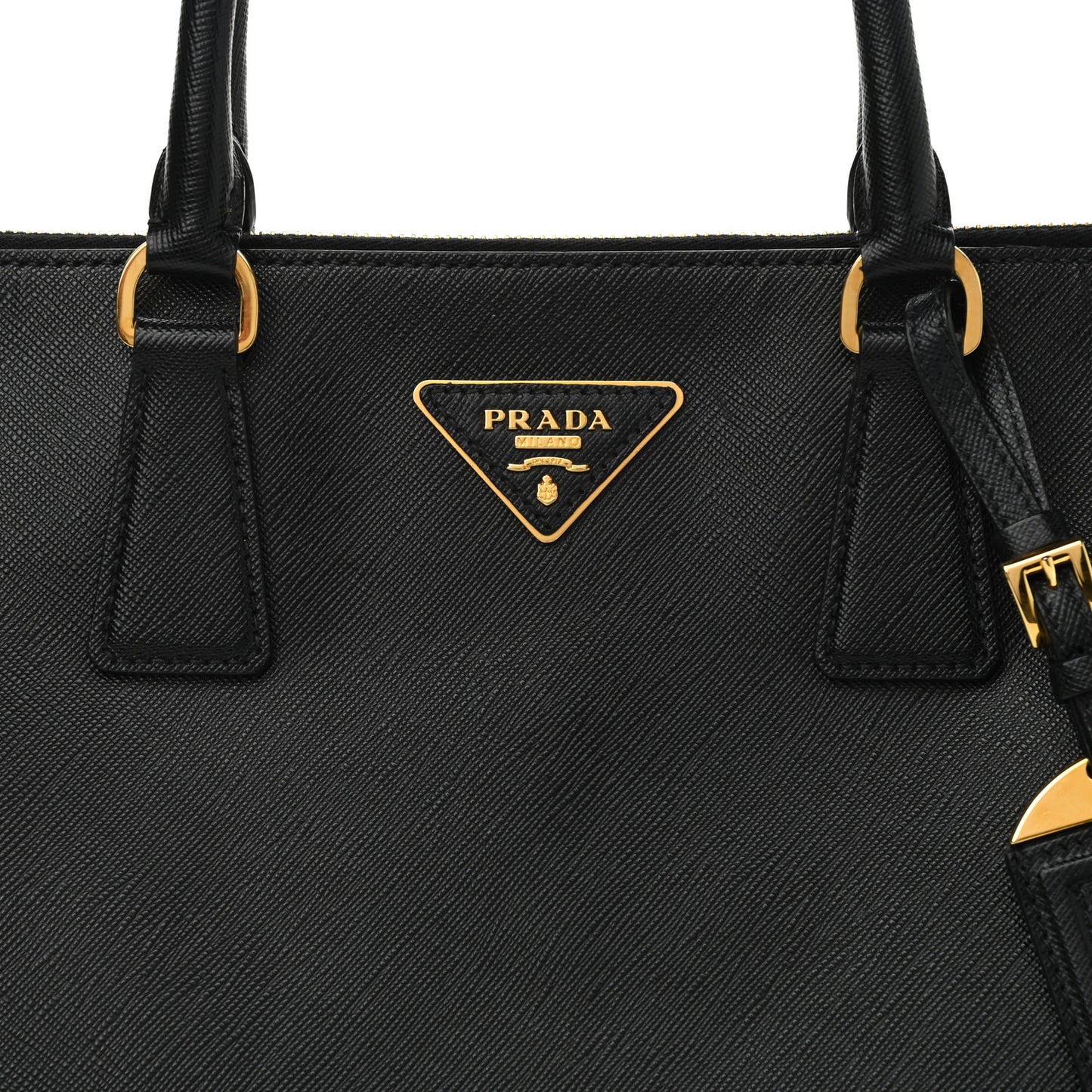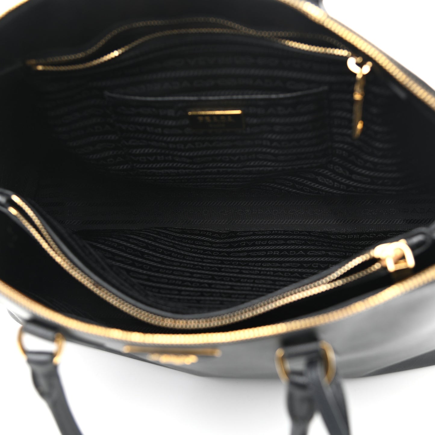 This is an authentic PRADA Saffiano Lux Large Promenade Tote in Black. This stylish tote is crafted of Prada signature saffiano cross grained leather in black. The bag features rolled leather top handles with polished gold links. The top zipper opens to a black fabric interior with a zipper compartment, zipper and patch pockets.Follow this item for alerts. Prada is a registered trademark of Prada. FASHIONPHILE is not affiliated with Prada.