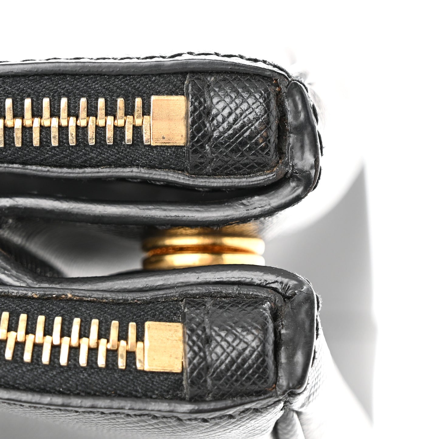 This is an authentic PRADA Saffiano Medium Galleria Double Zip Tote in Black. This chic tote is crafted of Saffiano cross-grain leather in black. The bag features rolled leather top handles with polished brass links, an optional shoulder strap with brass clasps, with a hanging clochette. The top is open and features two full-length side zippered compartments and a black Prada monogram jacquard interior with zipper and patch pockets.Follow this item for alerts. Prada is a registered trademark of Prada. FASHIONPHILE is not affiliated with Prada.