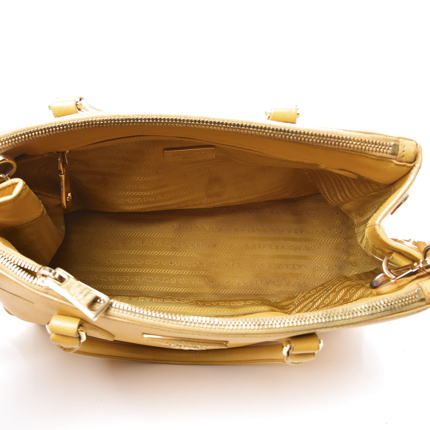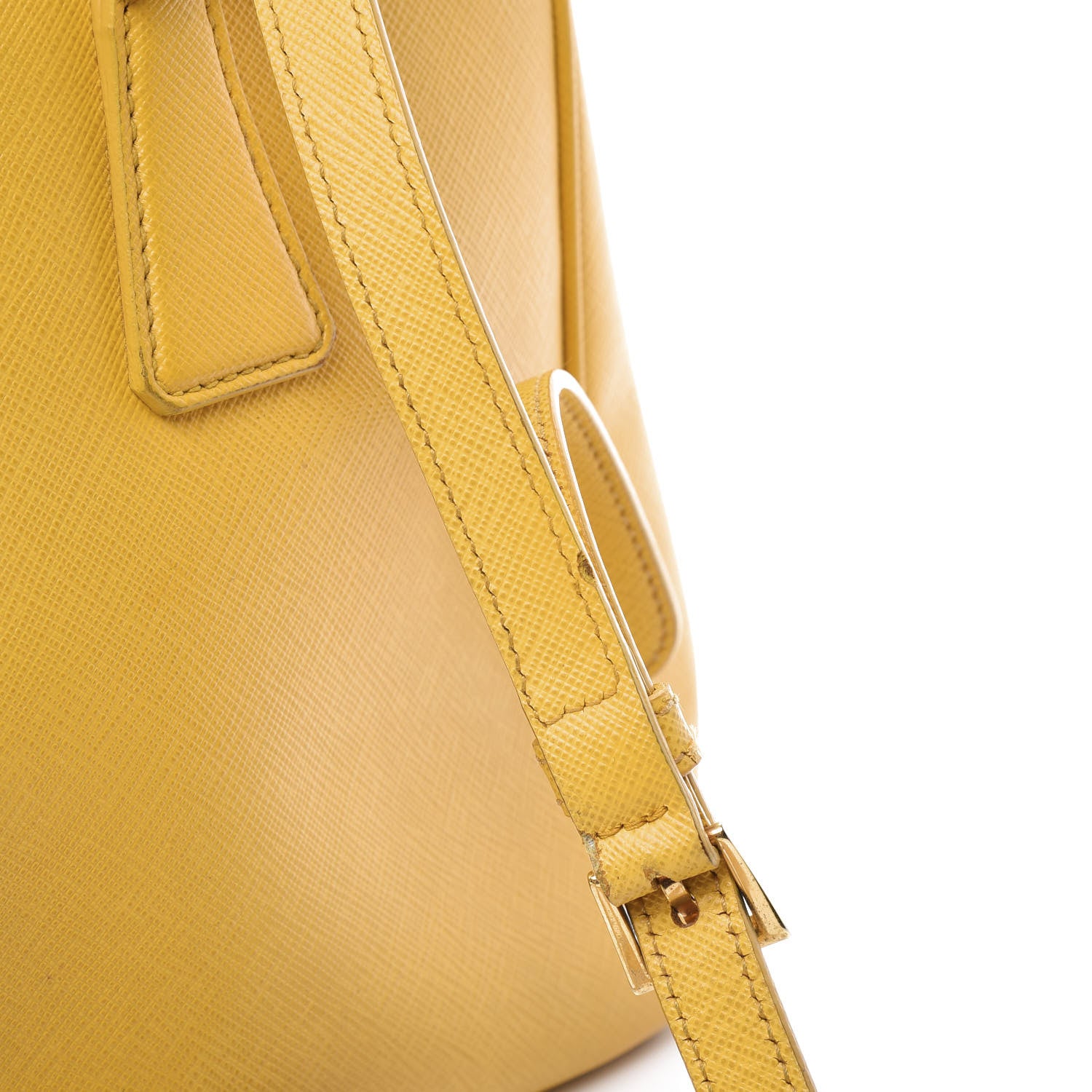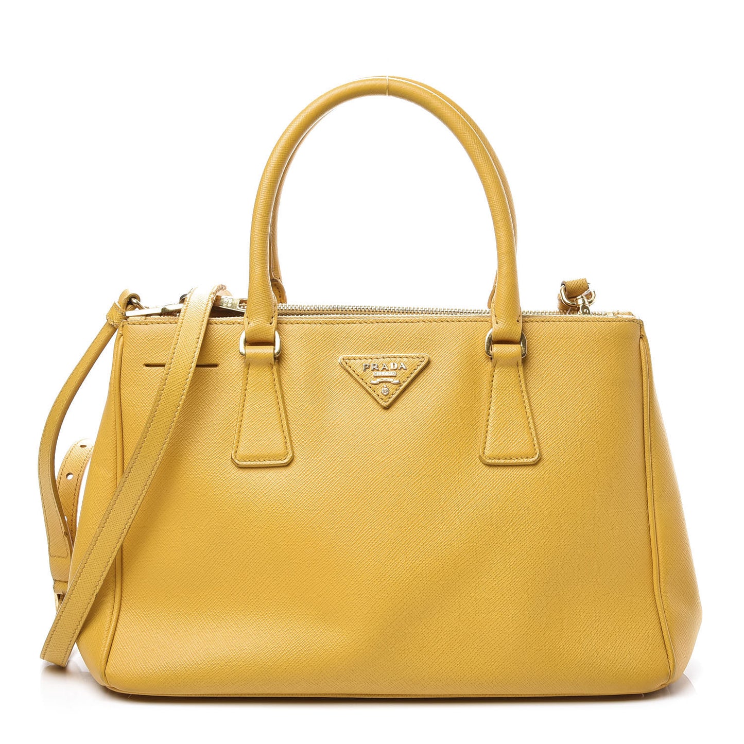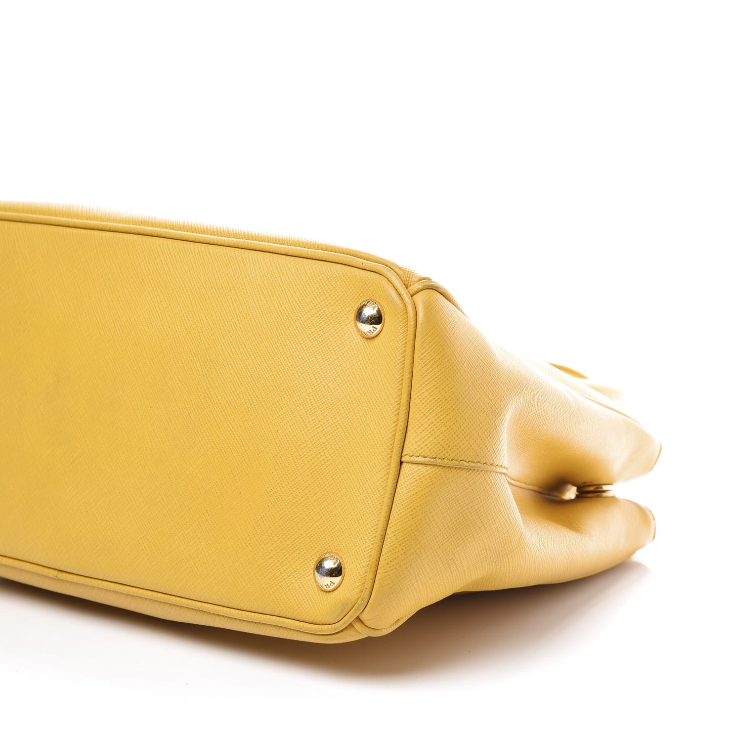 This is an authentic PRADA Saffiano Small Galleria Double Zip Tote in Mimosa. This stylish tote is crafted of Prada signature saffiano cross-grain leather in yellow. It features rolled leather top handles with brass handle links, an adjustable shoulder strap with brass clasps, and a zippered pocket on either side of the main compartment. The top is open to a yellow Prada monogram jacquard fabric interior with zipper and patch pockets. This handbag has the stylish sophistication of Prada!Follow this item for alerts. Prada is a registered trademark of Prada. FASHIONPHILE is not affiliated with Prada.