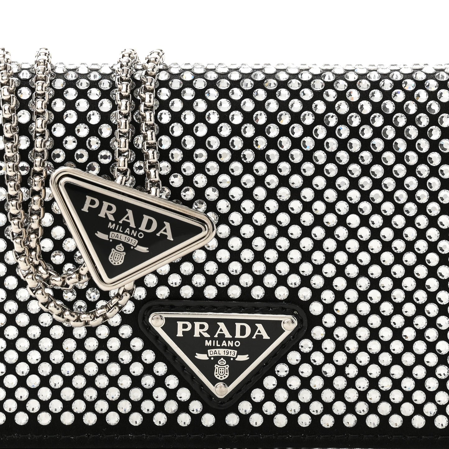 Prada/ Accessories/ Clutch & Evening /Prada Satin Crystal Metal Triangle Logo Card Holder With Strap Cristal