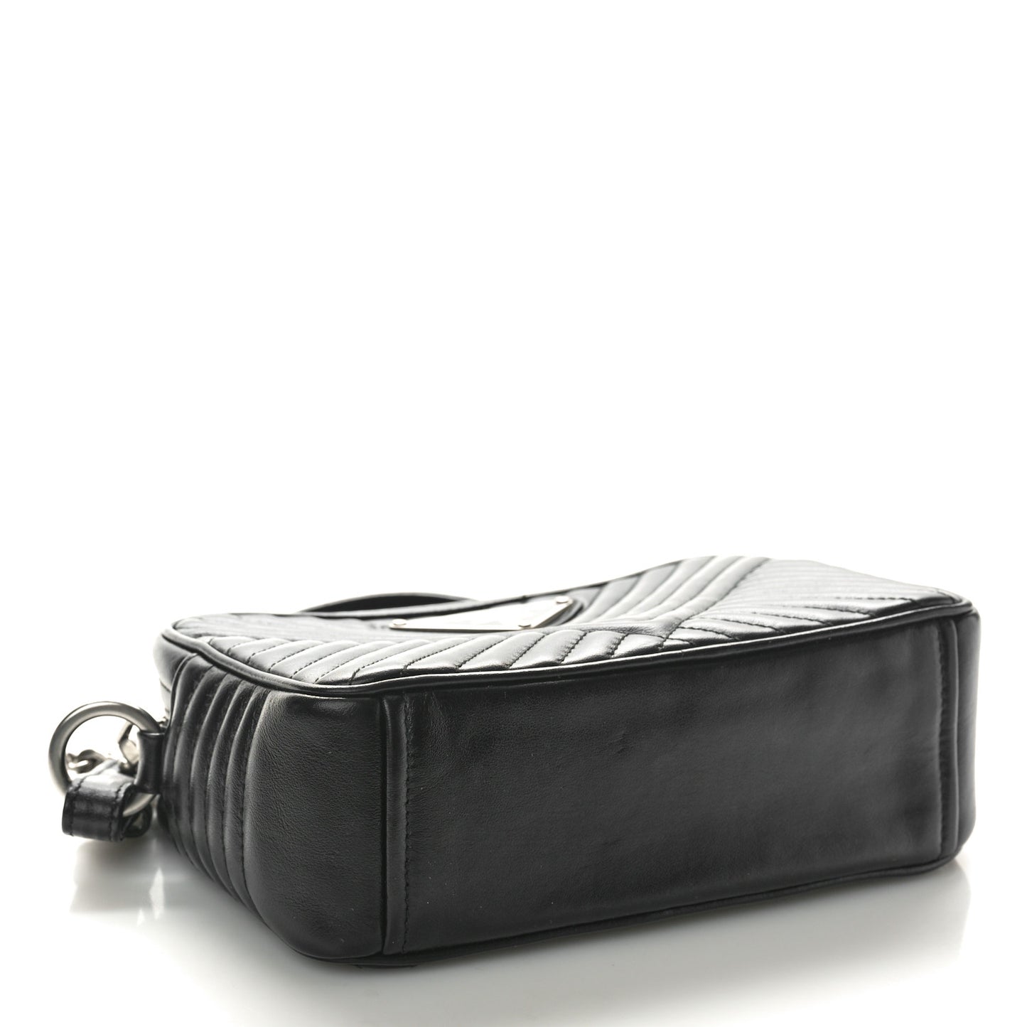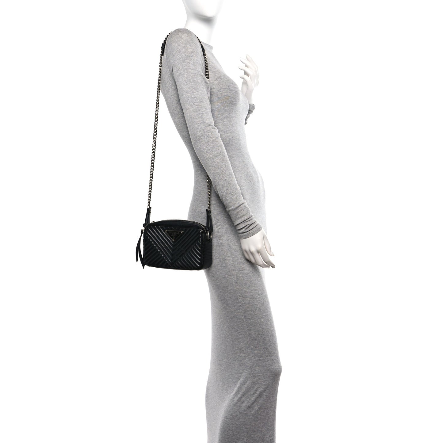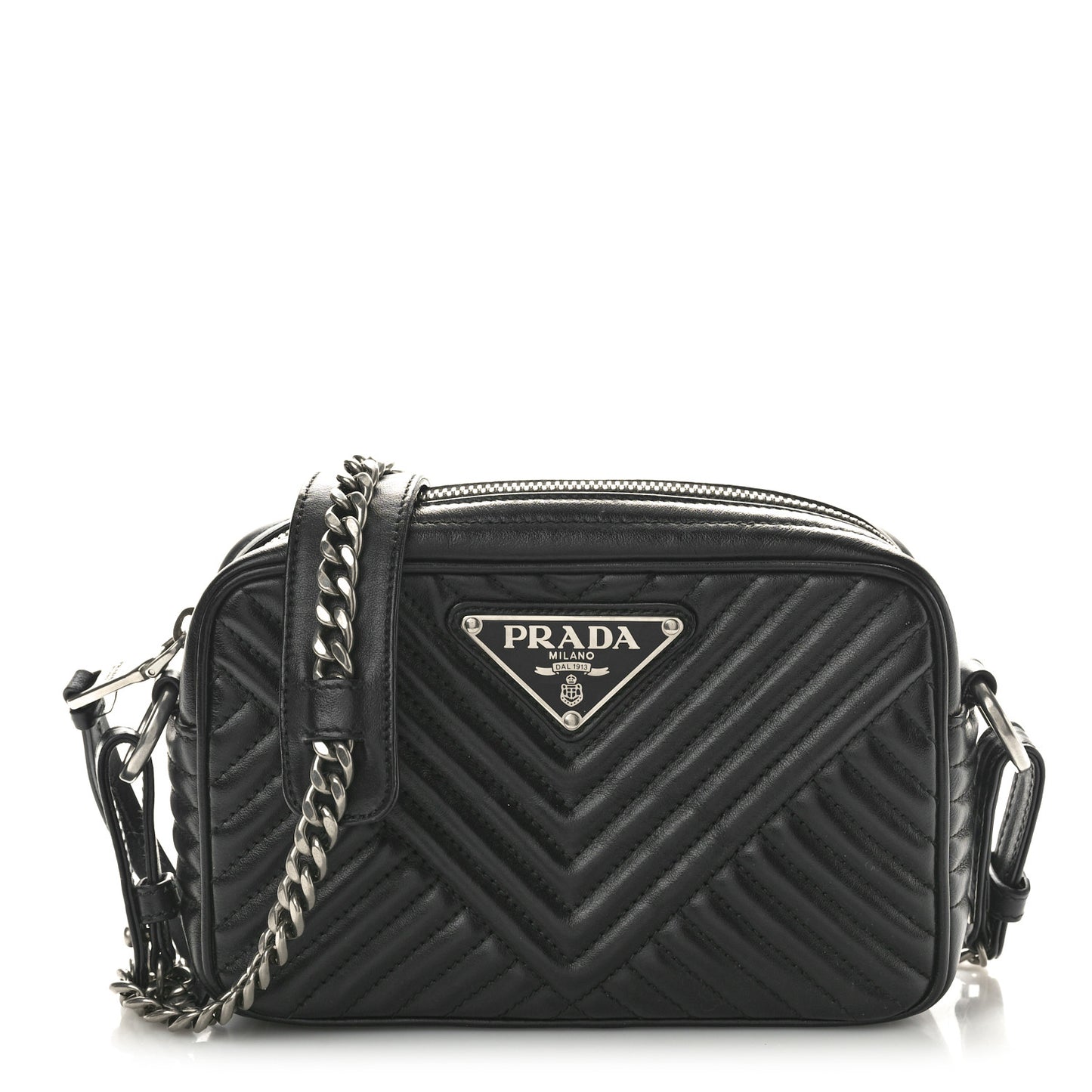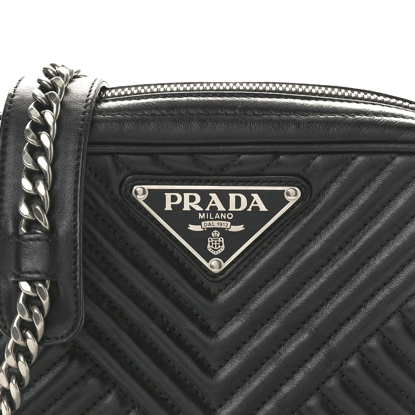 This is an authentic PRADA Soft Calfskin Diagramme Crossbody Bag in Black. This is a chic Prada handbag that is beautifully crafted of quilted calfskin leather in black. The crossbody bag features an aged silver chain shoulder strap and a top zipper that opens to a black fabric interior with a patch pocket.Follow this item for alerts. Prada is a registered trademark of Prada. FASHIONPHILE is not affiliated with Prada.