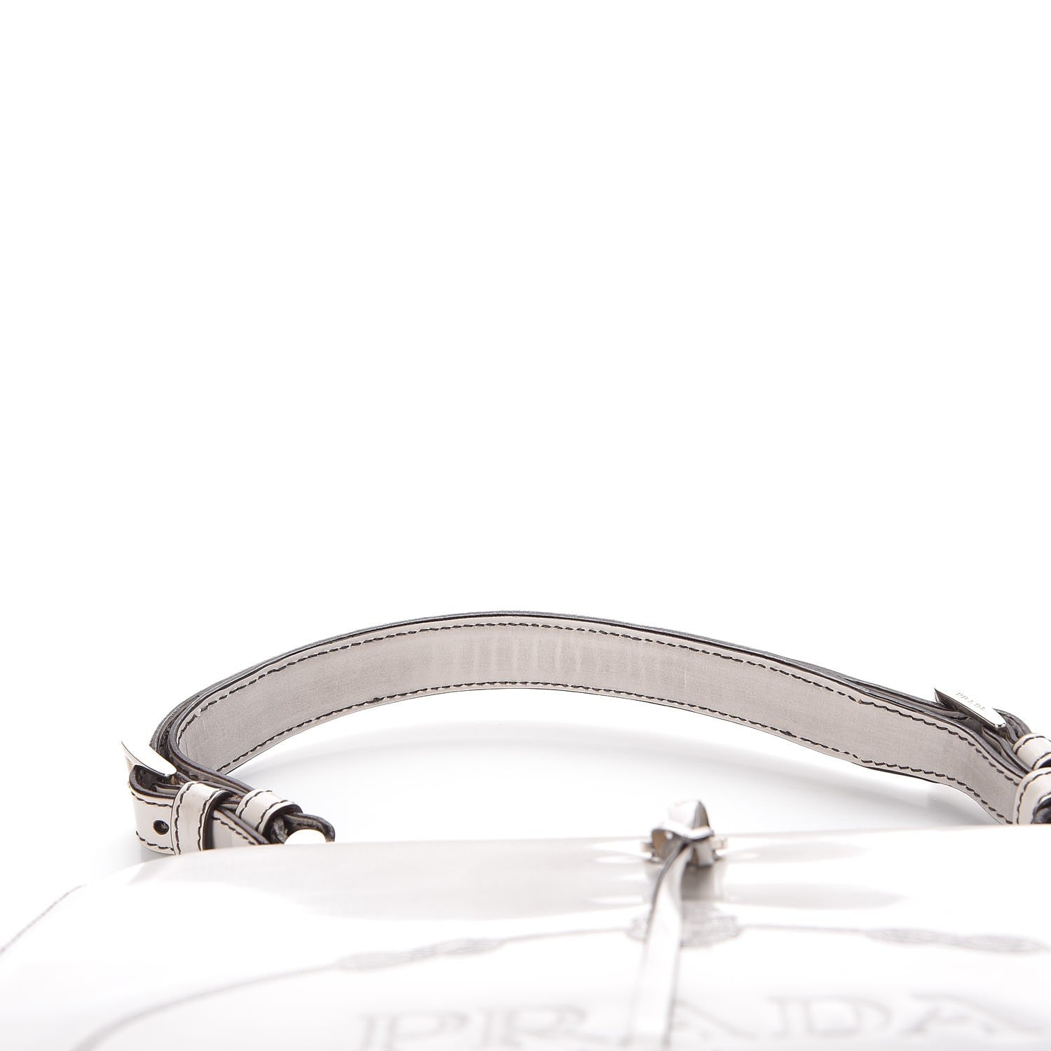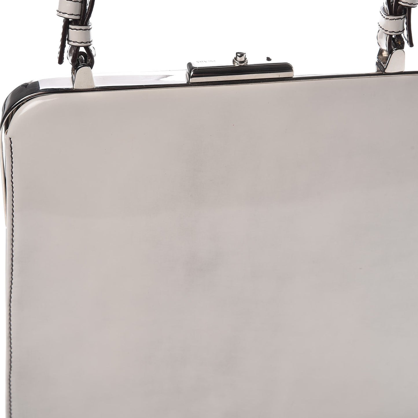 This is an authentic PRADA Spazzolato Logo Print Framed Bag in Quarzo. This lovely tote is crafted of smooth polished spazzolato leather with a large embossed circular Prada classic logo. This bag features a leather strap top handles and a silver press lock with a hanging leather clochette with keys to the lock. The top opens to a leather interior. This is a chic tote, ideal for daily essentials, from Prada!Follow this item for alerts. Prada is a registered trademark of Prada. FASHIONPHILE is not affiliated with Prada.