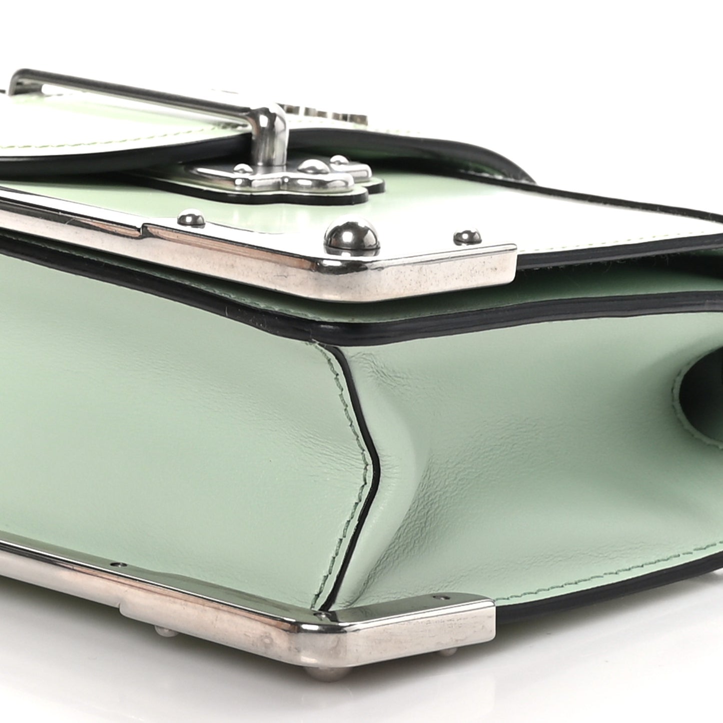 This is an authentic PRADA Spazzolato Soft Calf Cahier Chain Wristlet in Acqua. This stylish crossbody is crafted of Prada Spazzolato leather in mint green. The bag features a wristlet strap with stud detailing, an optional silver chain-link shoulder strap, and silver hardware including corner plates and closure. The top flap opens to a black leather interior with patch pockets.Follow this item for alerts. Prada is a registered trademark of Prada. FASHIONPHILE is not affiliated with Prada.
