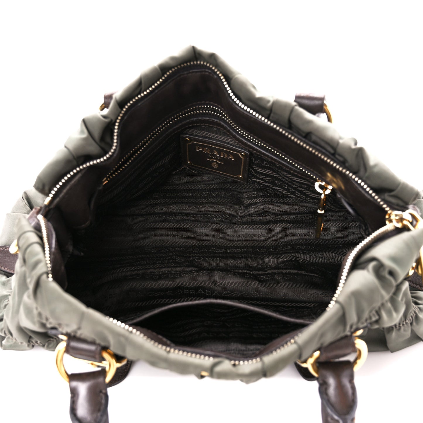 This is an authentic PRADA Tessuto Nylon Gaufre Shopping Satchel in Fumo. This distinctive satchel is crafted of pleated and gathered tessuto nylon in grey. The bag features rolled leather top handles, an optional shoulder strap, and polished brass hardware. The top opens to a matching Prada monogram jacquard weave fabric interior with zipper and patch pockets.Follow this item for alerts. Prada is a registered trademark of Prada. FASHIONPHILE is not affiliated with Prada.