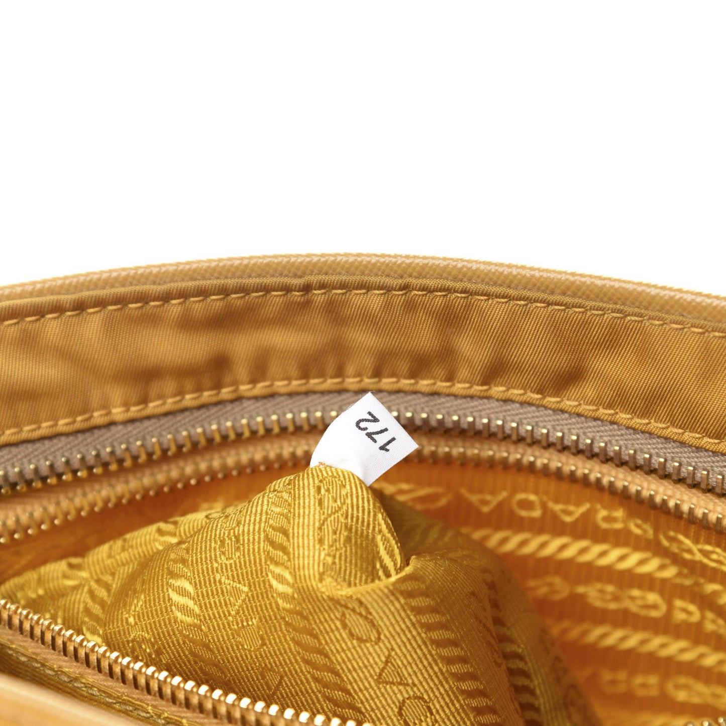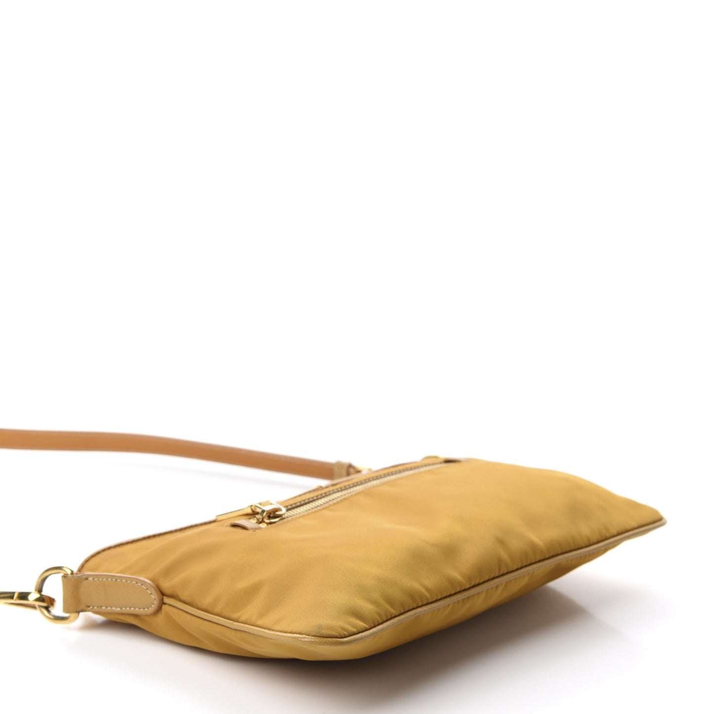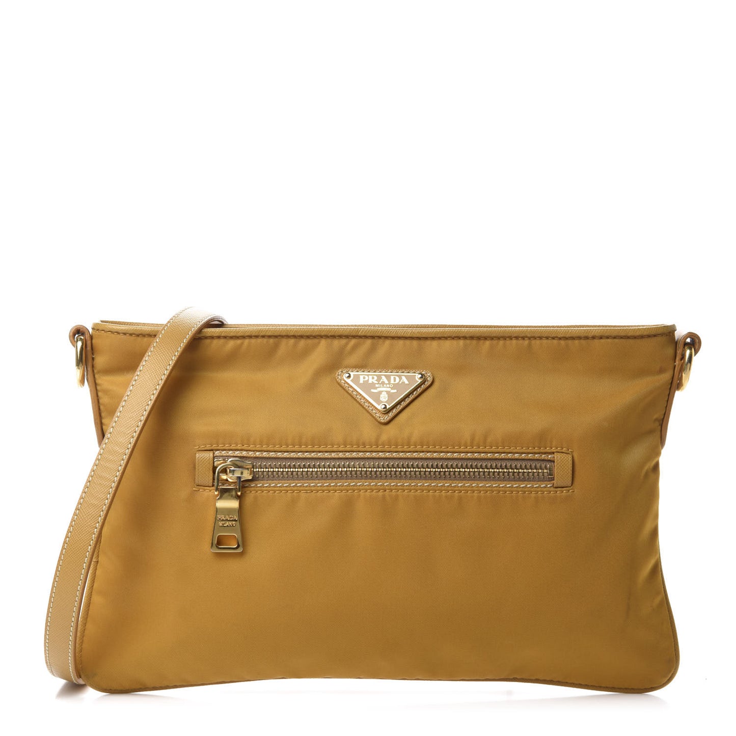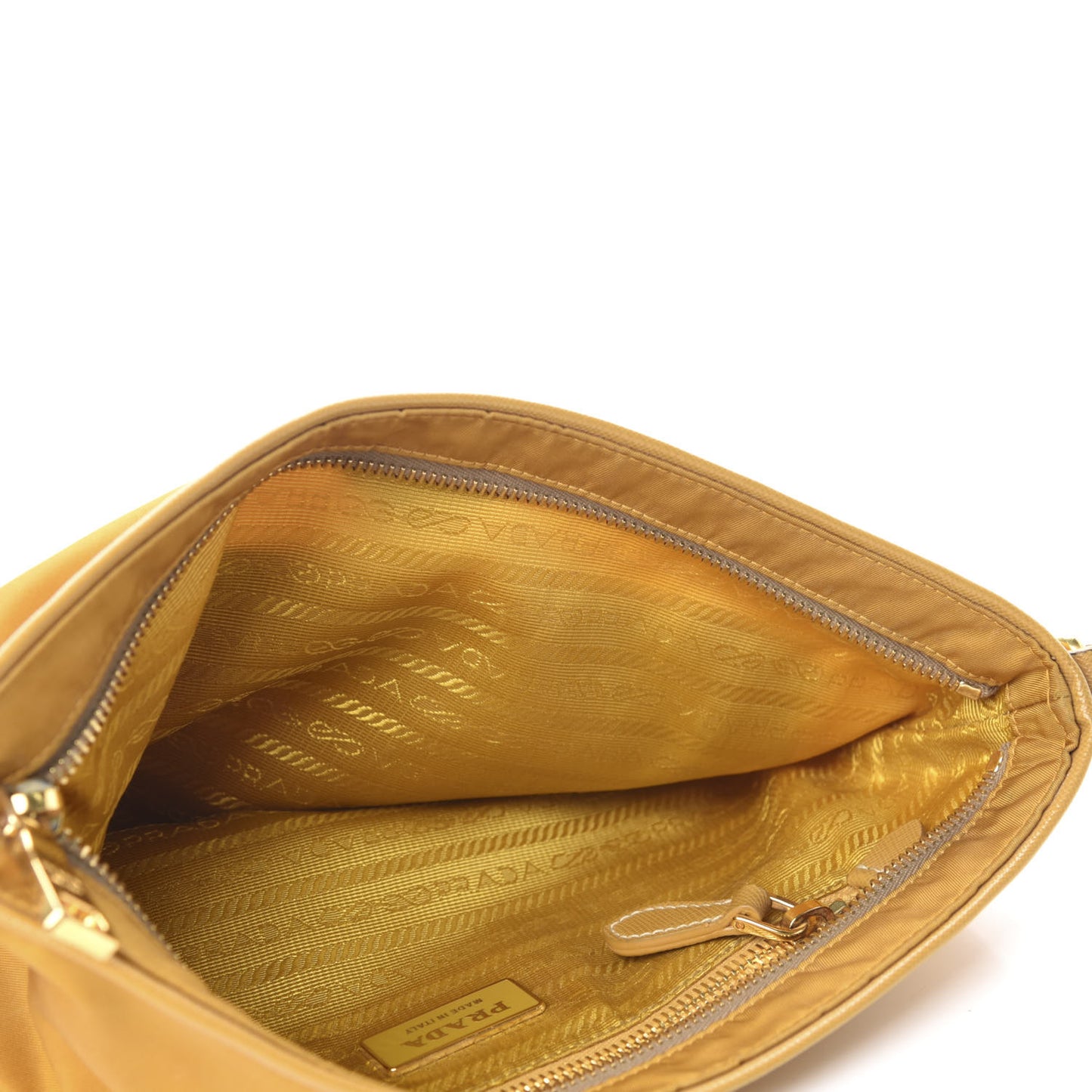 This is an authentic PRADA Tessuto Nylon Saffiano Crossbody Bag in Senape. This stylish shoulder bag is crafted of dark yellow nylon with matching leather trim. It features an adjustable leather shoulder strap, gold hardware, and a front zipper pocket with a Prada logo above it. The top zipper opens to a dark yellow Prada monogram jacquard fabric interior. This is a stylish shoulder bag for everyday use, from Prada!Follow this item for alerts. Prada is a registered trademark of Prada. FASHIONPHILE is not affiliated with Prada.