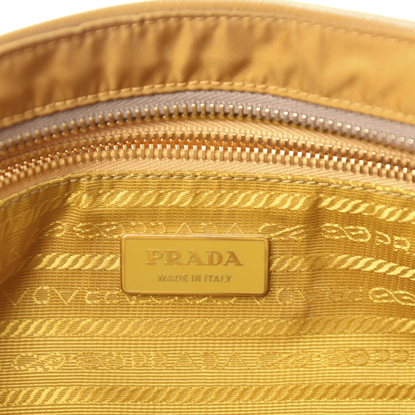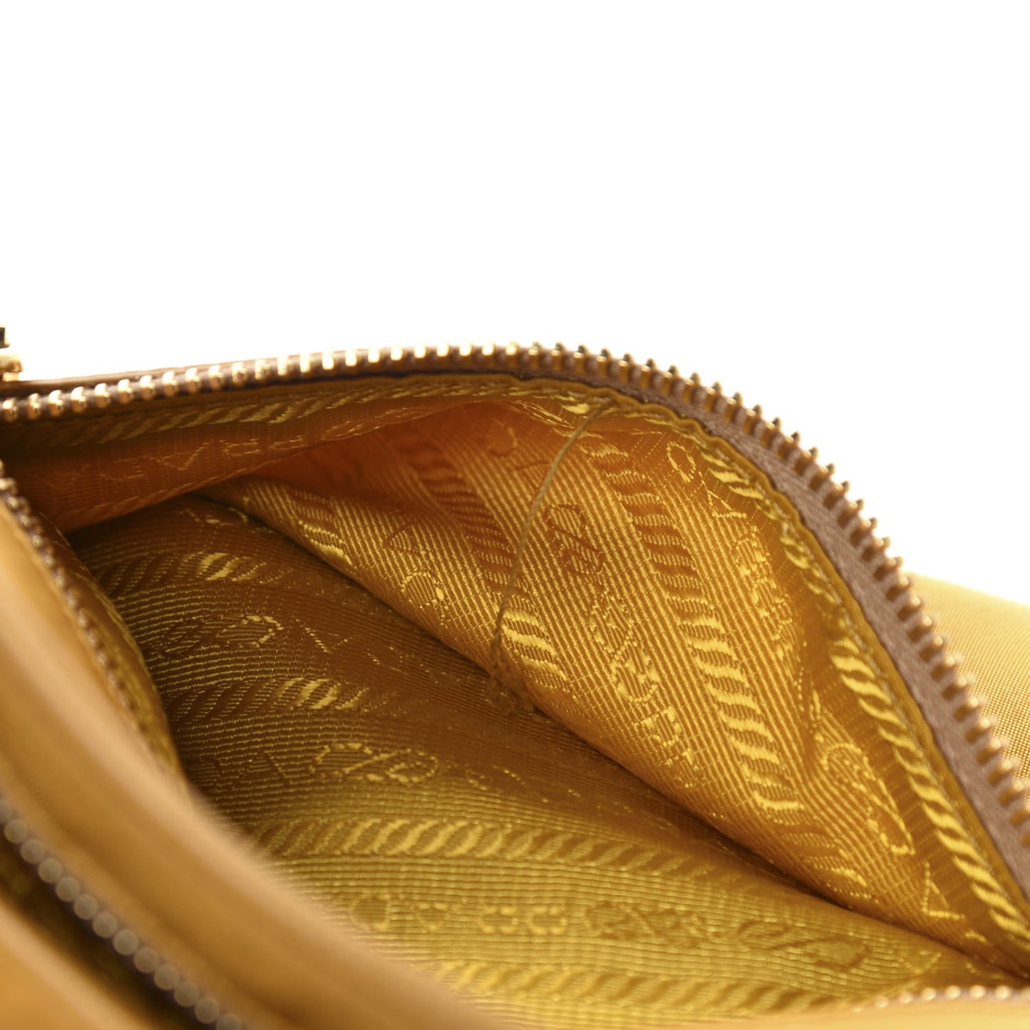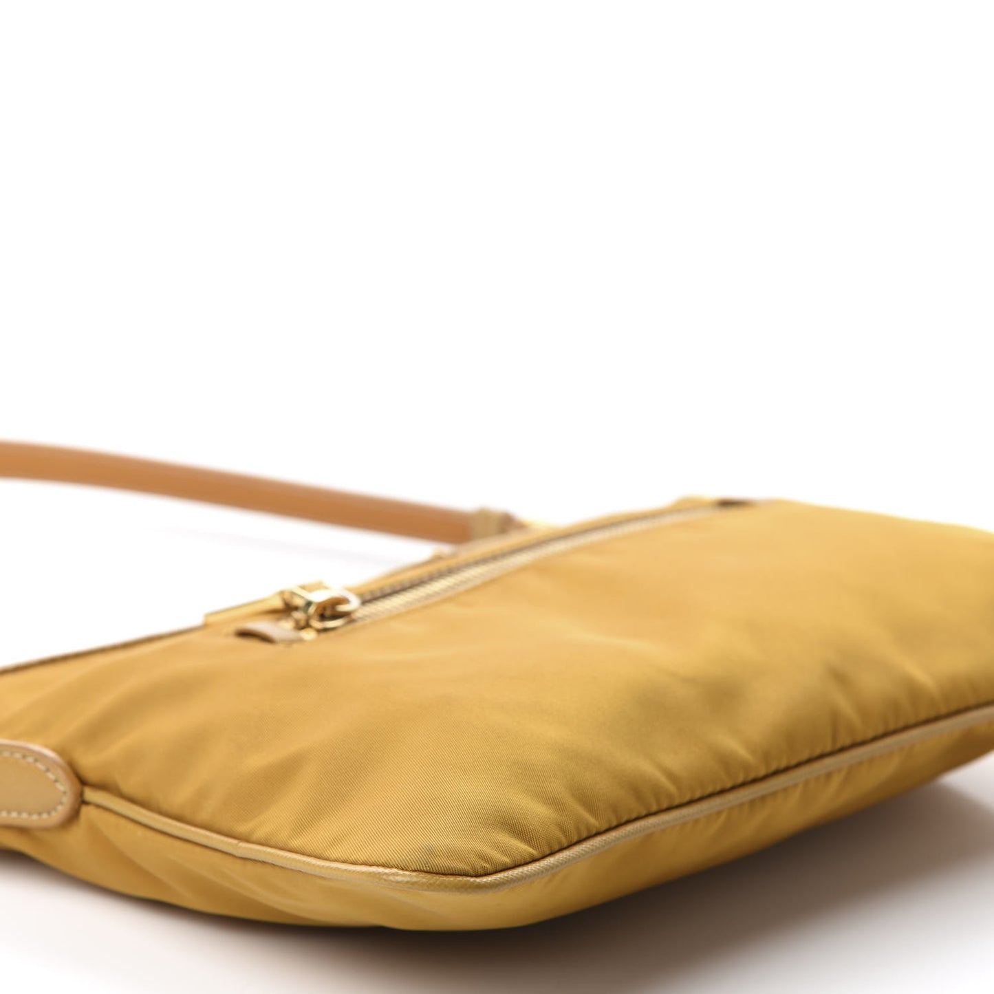 This is an authentic PRADA Tessuto Nylon Saffiano Crossbody Bag in Senape. This stylish shoulder bag is crafted of dark yellow nylon with matching leather trim. It features an adjustable leather shoulder strap, gold hardware, and a front zipper pocket with a Prada logo above it. The top zipper opens to a dark yellow Prada monogram jacquard fabric interior. This is a stylish shoulder bag for everyday use, from Prada!Follow this item for alerts. Prada is a registered trademark of Prada. FASHIONPHILE is not affiliated with Prada.