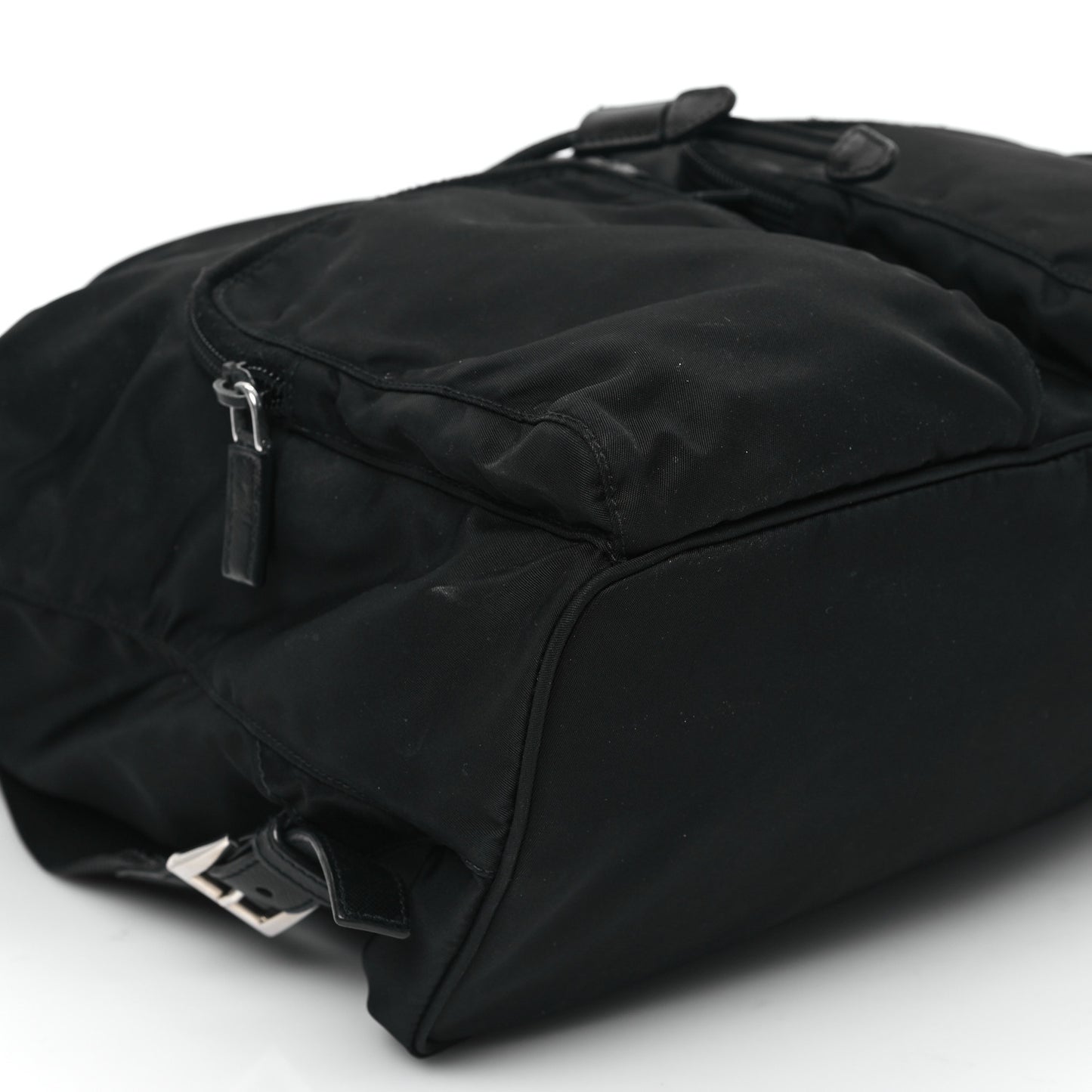 This is an authentic PRADA Tessuto Nylon Saffiano Vela Backpack in Black. This backpack is crafted of durable nylon fabric. It features adjustable nylon shoulder straps with silver buckles, two external zipper pockets, and a top cross-over flap with a strap and silver buckle closure. This opens to a nylon cinch cord and a black Prada monogram jacquard fabric interior with a zipper and patch pocket.Follow this item for alerts. Prada is a registered trademark of Prada. FASHIONPHILE is not affiliated with Prada.