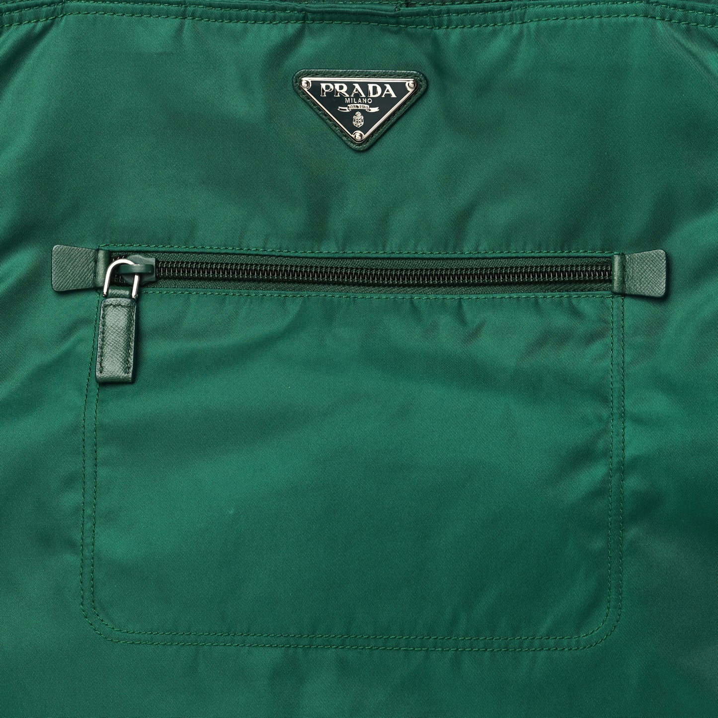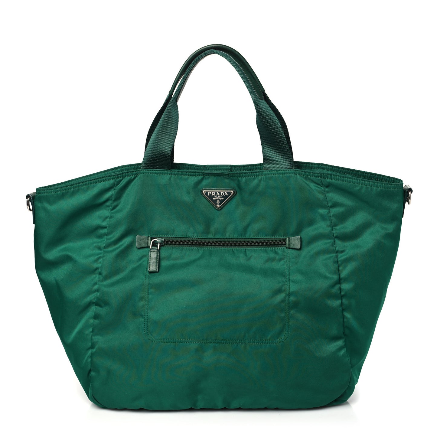 This is an authentic PRADA Tessuto Nylon Shopping Tote in Oleandro. This stylish tote is crafted of soft nylon fabric. It features green nylon top handles, an optional adjustable shoulder strap, frontal zipper pocket and silver hardware. The top opens with a zipper to Prada jacquard fabric interior with zipper and patch pockets.Follow this item for alerts. Prada is a registered trademark of Prada. FASHIONPHILE is not affiliated with Prada.