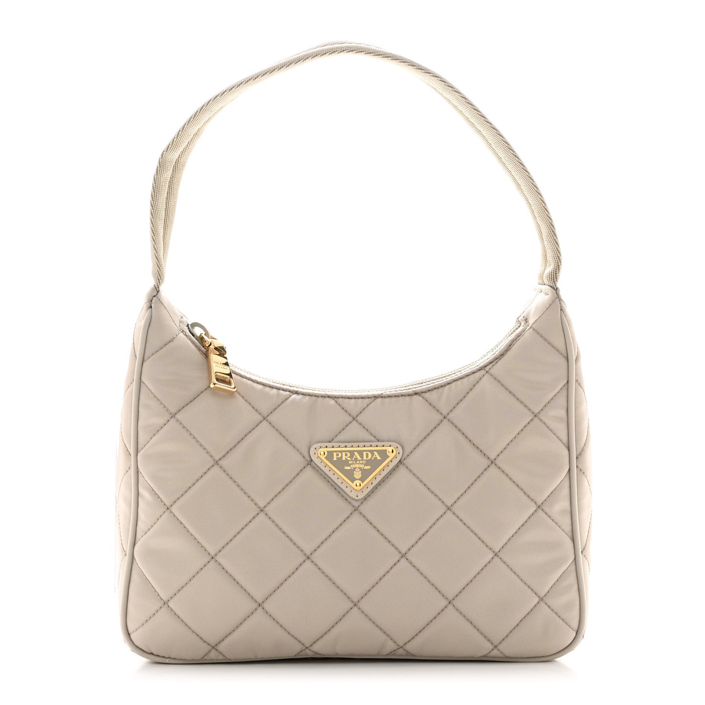 This is an authentic PRADA Tessuto Nylon Stitched Shoulder Bag in Pomice. This stunning bag is beautifully crafted of light grey diamond quilted tessuto nylon. The bag features a looping shoulder strap, and gold hardware. The top zipper opens the bag to a matching Prada logo jacquard weave interior.Follow this item for alerts. Prada is a registered trademark of Prada. FASHIONPHILE is not affiliated with Prada.